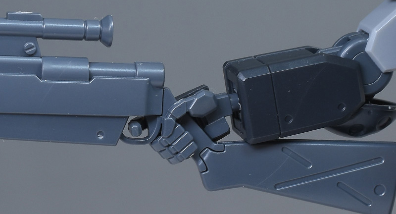 狙撃用ライフルは手首に角度の付いた武器持ち手で保持します。手の平にグリップのダボを固定するため、しっかりとした保持が可能。角度の付いていない通常の持ち手でも保持できますが、こちらのほうが自然な形で保持できるので取り扱いがラクです。