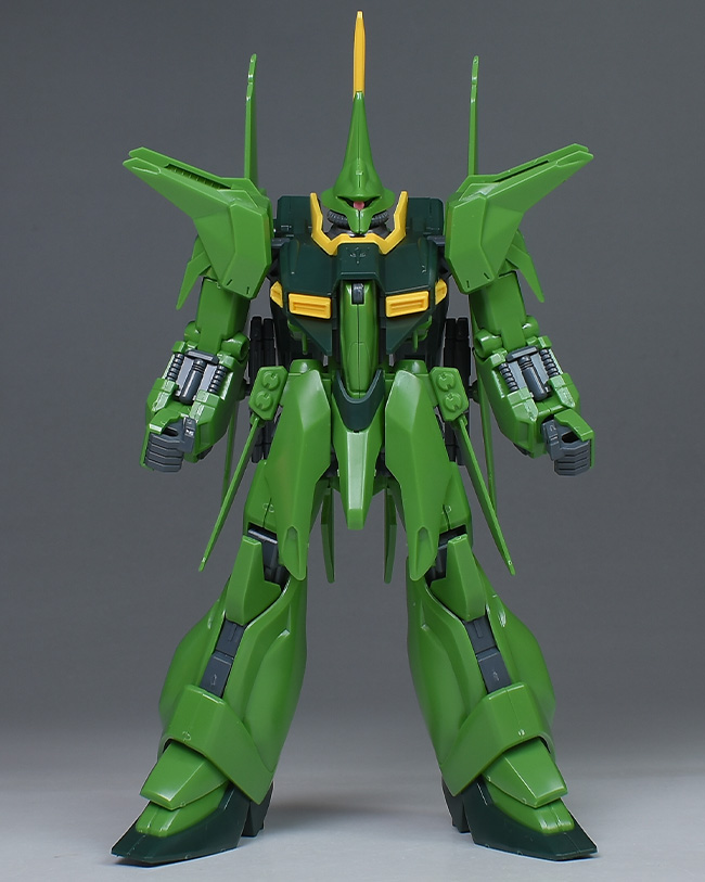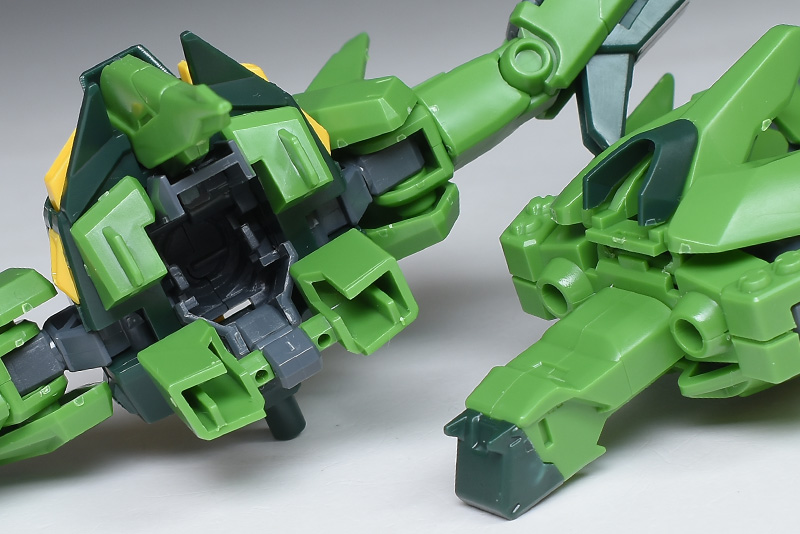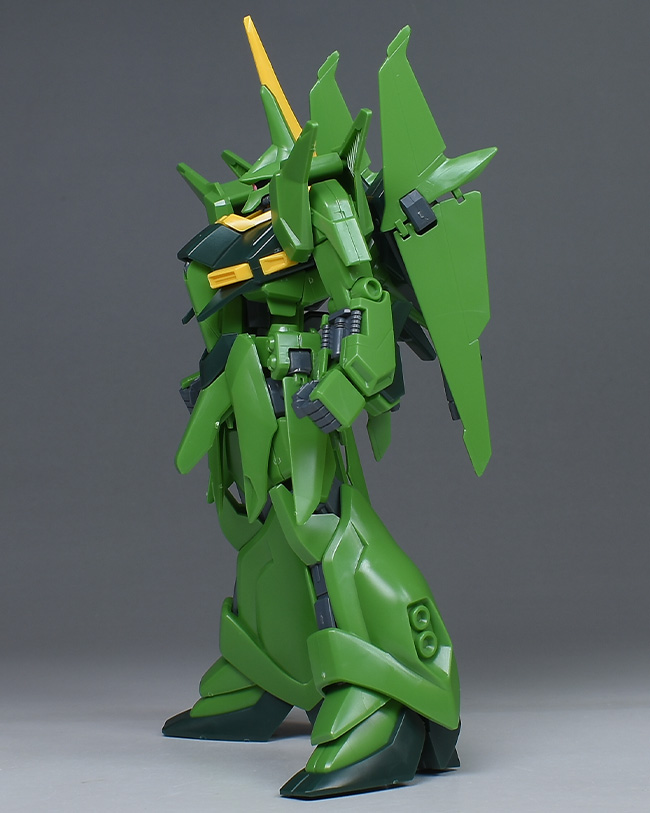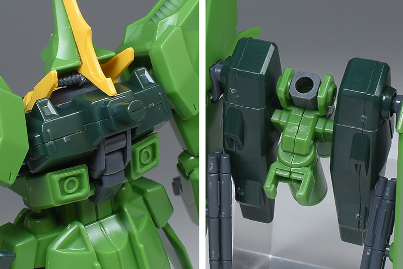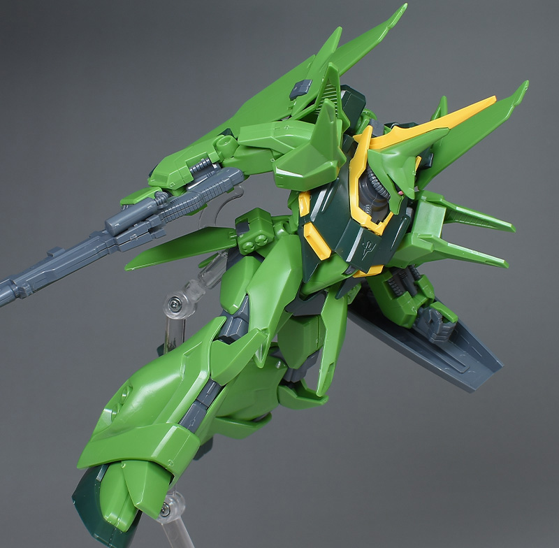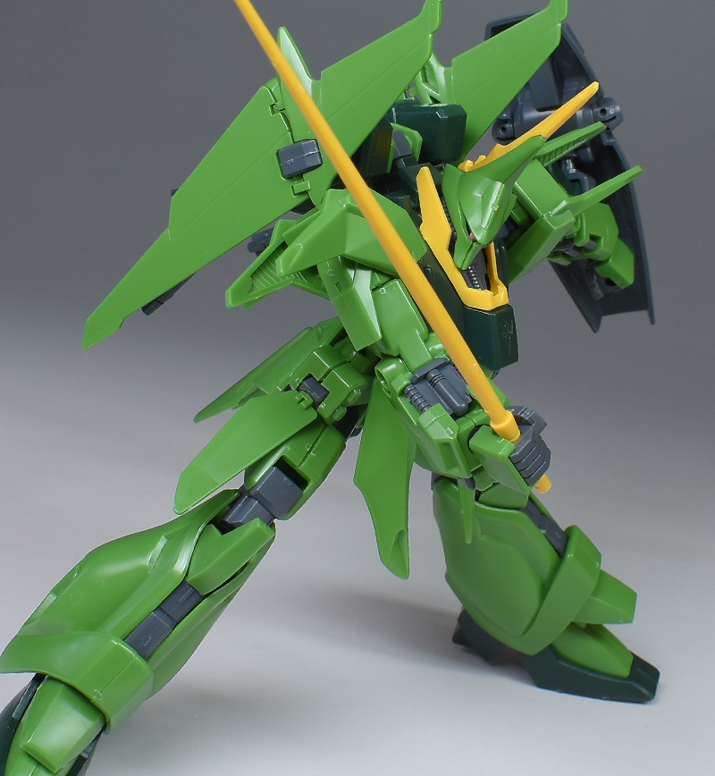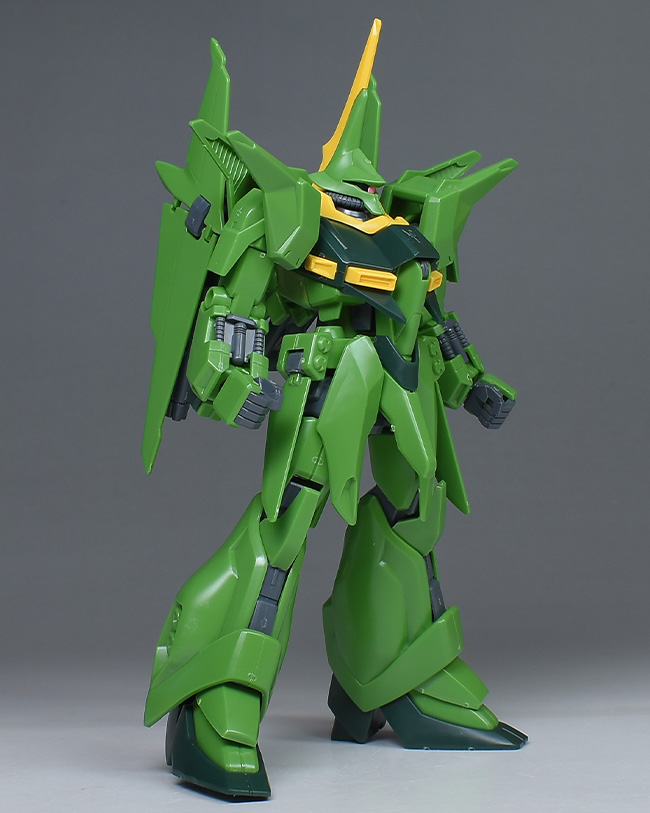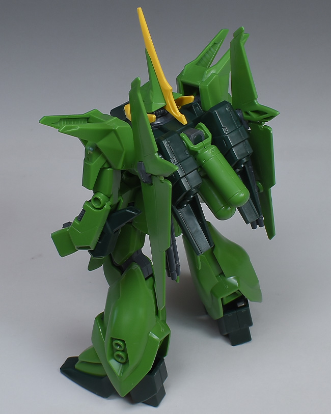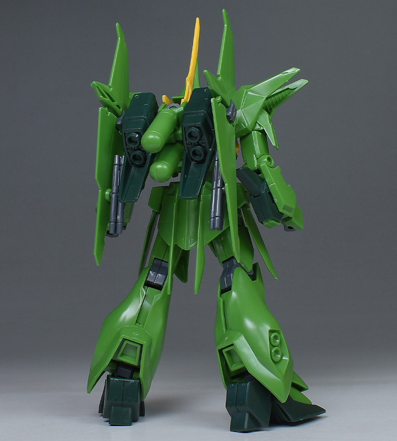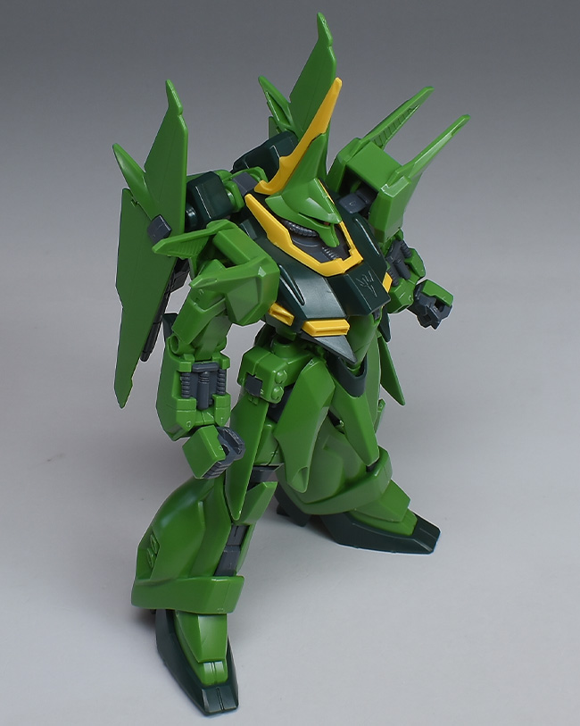 成形色ややや明るめのグリーンを基調に、胴体部やバックパック、ソール部にダークグリーン、頭部や胴体部、ビーム・サーベルなどにイエローを配色。その他、内部や関節、一部外装や武装類などがグレー成形色での再現となっています。