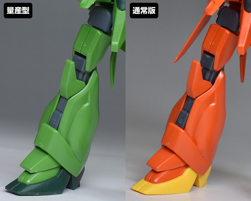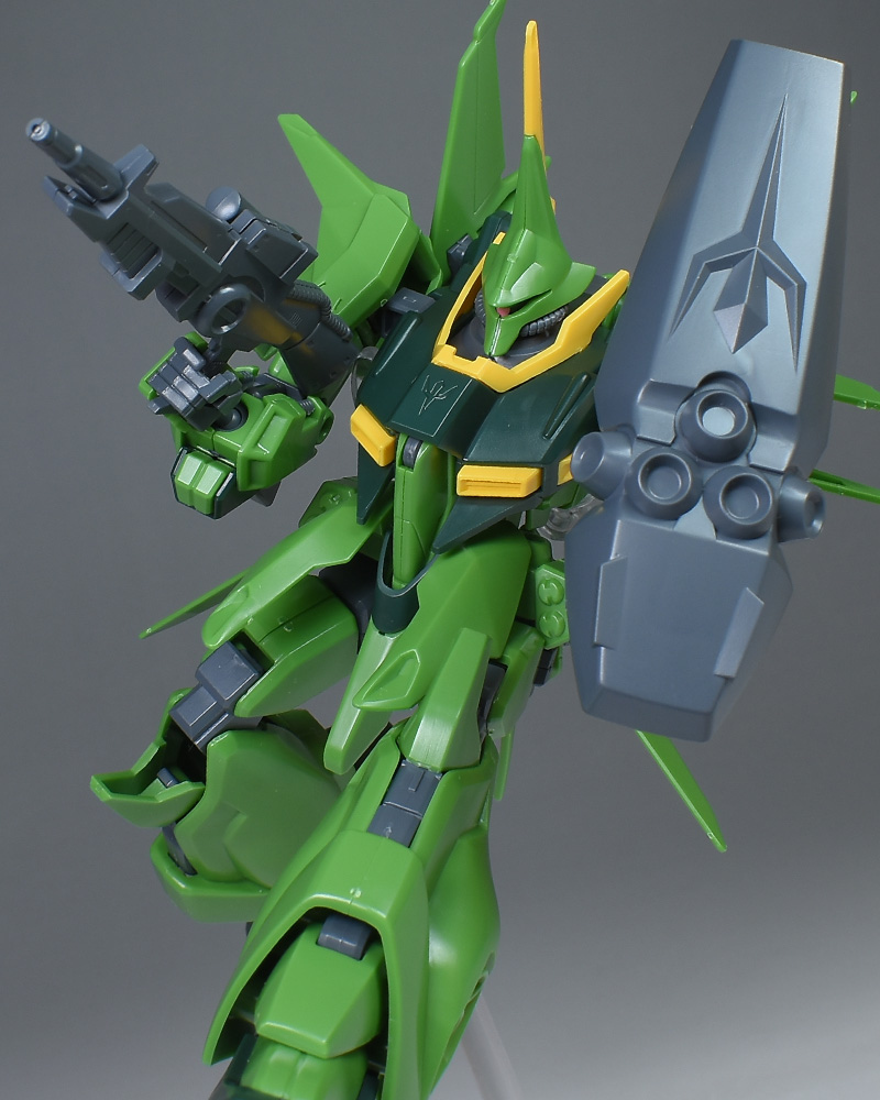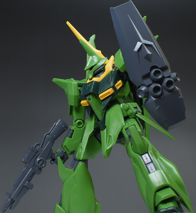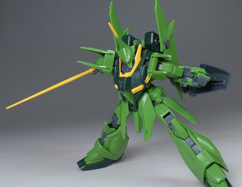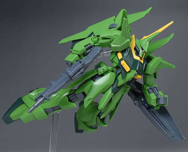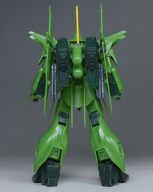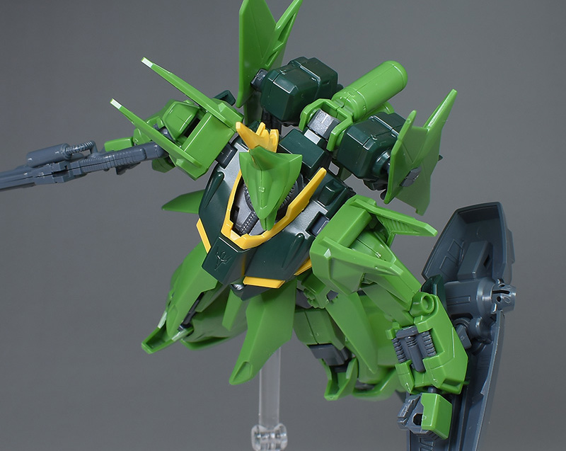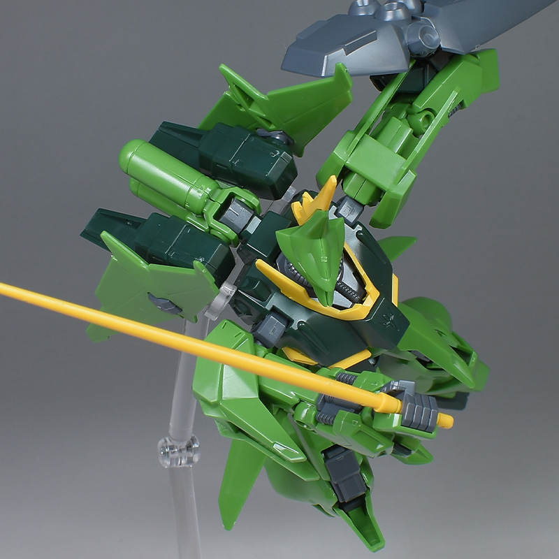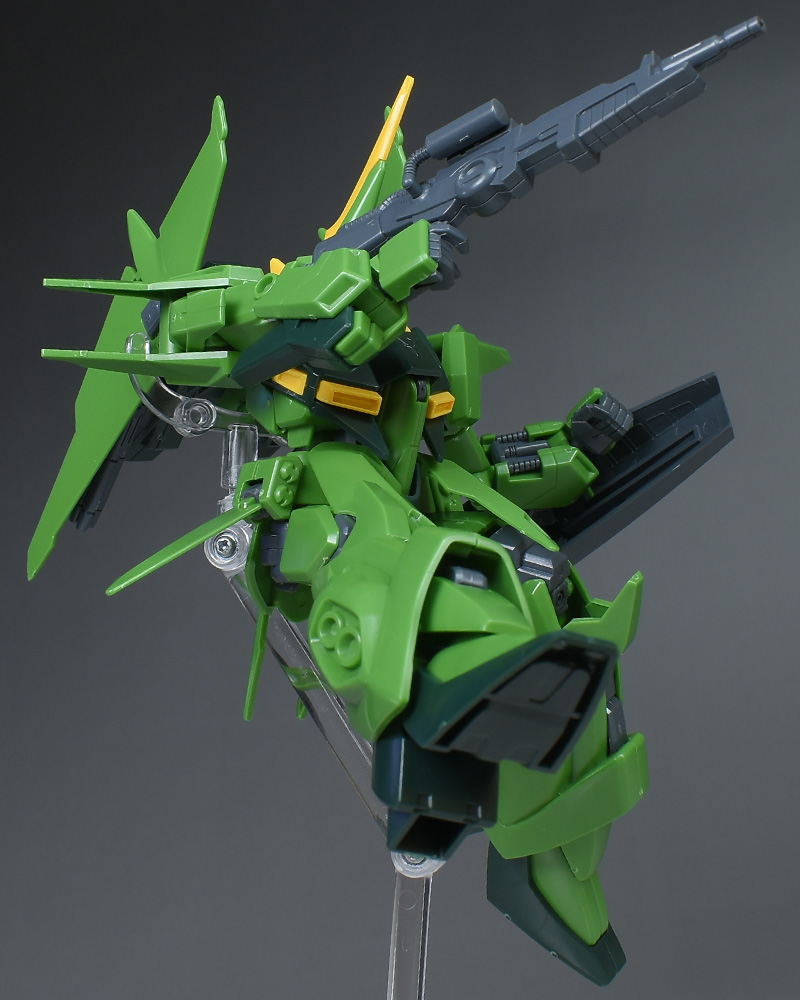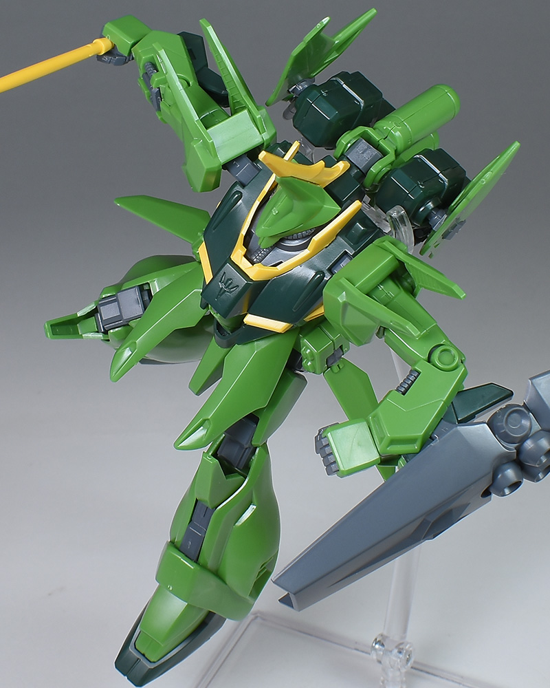 成形色ややや明るめのグリーンを基調に、胴体部やバックパック、ソール部にダークグリーン、頭部や胴体部、ビーム・サーベルなどにイエローを配色。その他、内部や関節、一部外装や武装類などがグレー成形色での再現となっています。