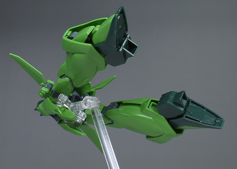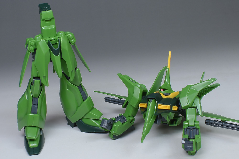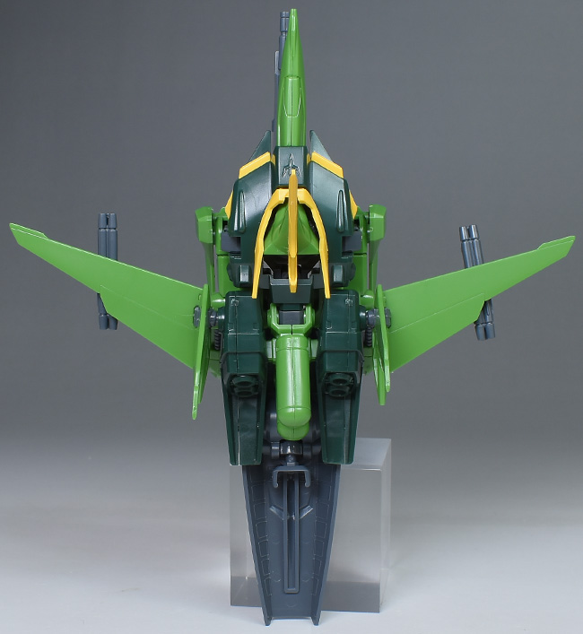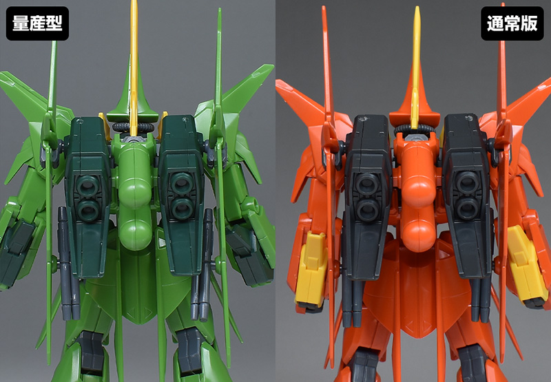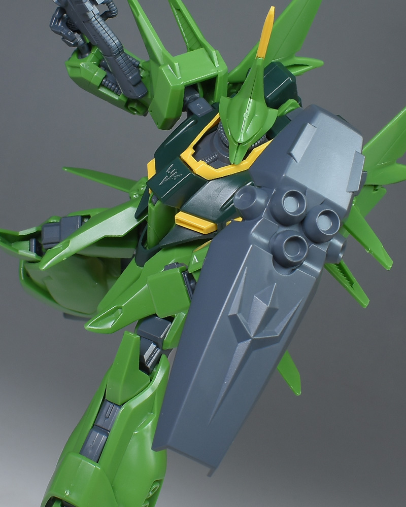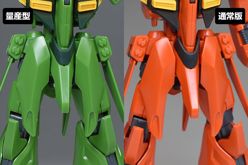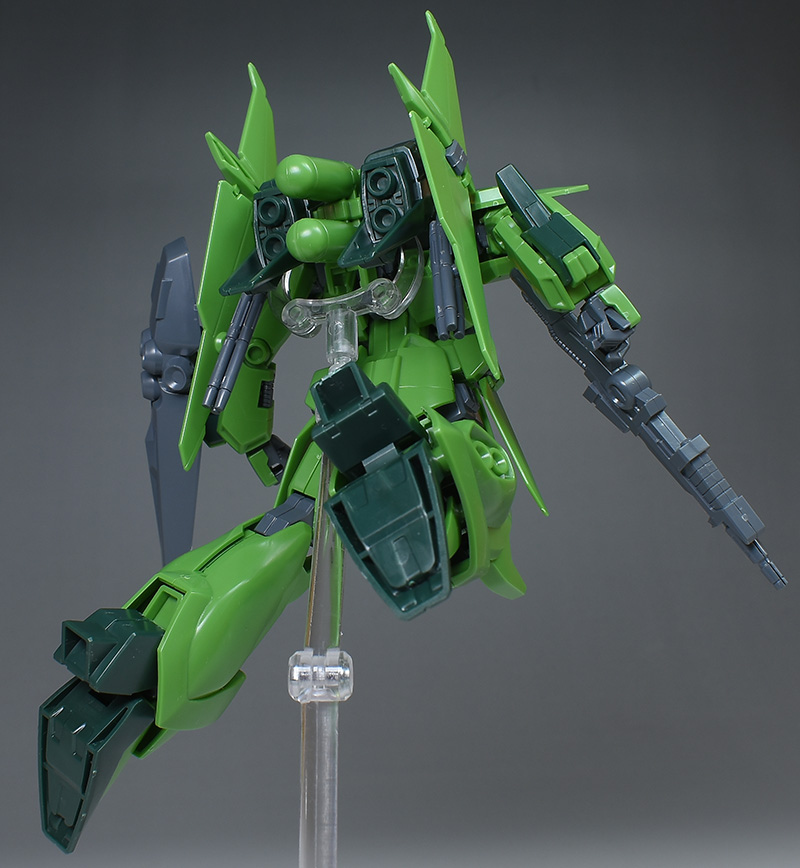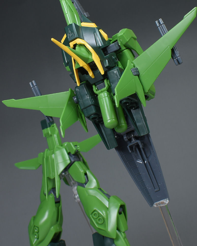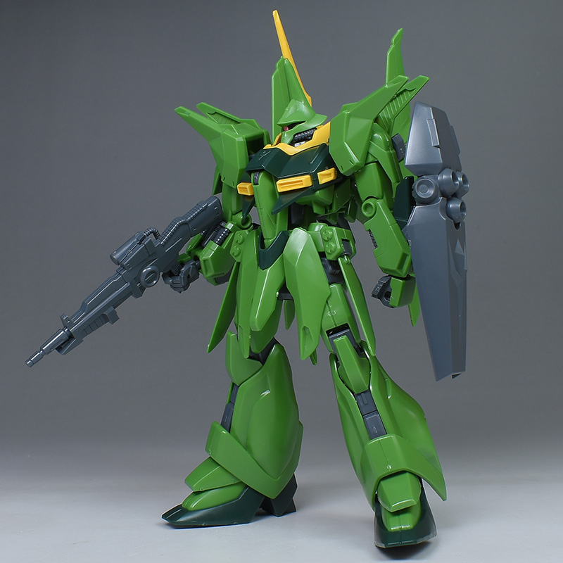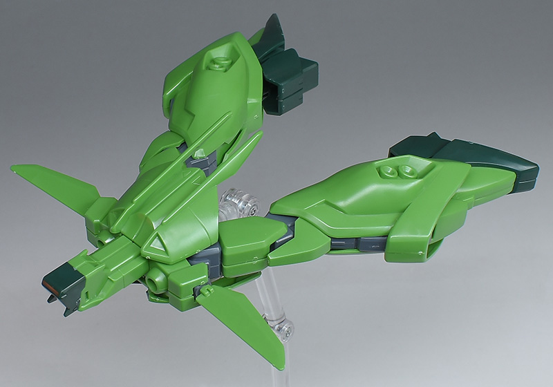 成形色ややや明るめのグリーンを基調に、胴体部やバックパック、ソール部にダークグリーン、頭部や胴体部、ビーム・サーベルなどにイエローを配色。その他、内部や関節、一部外装や武装類などがグレー成形色での再現となっています。