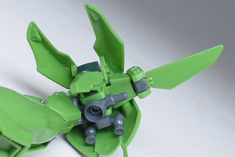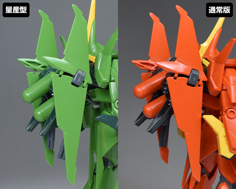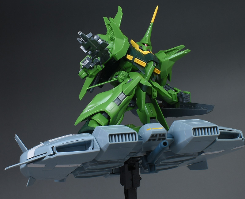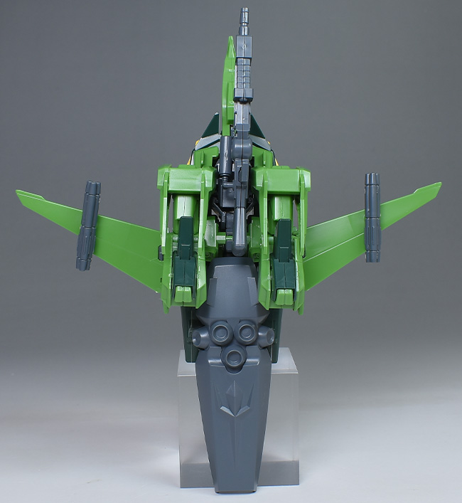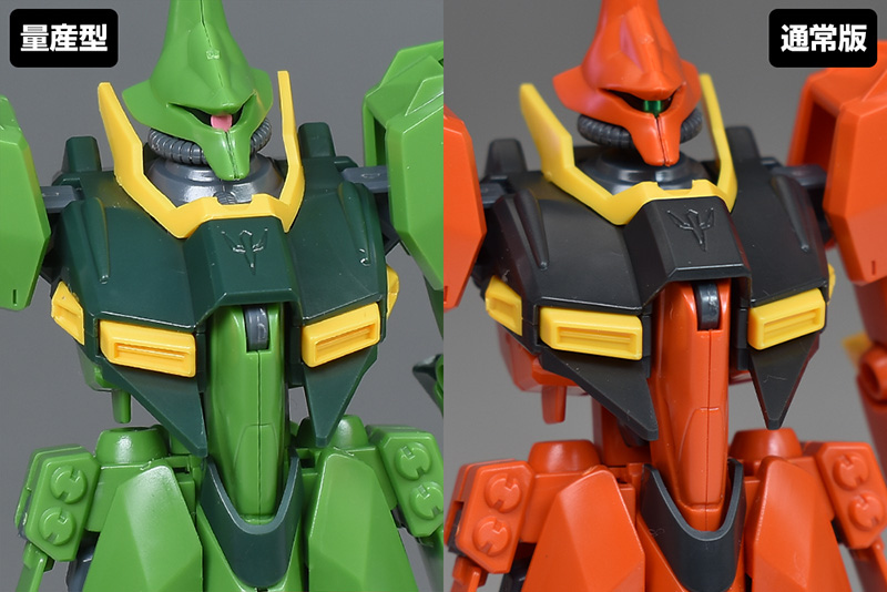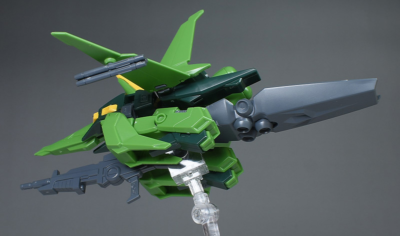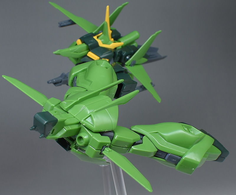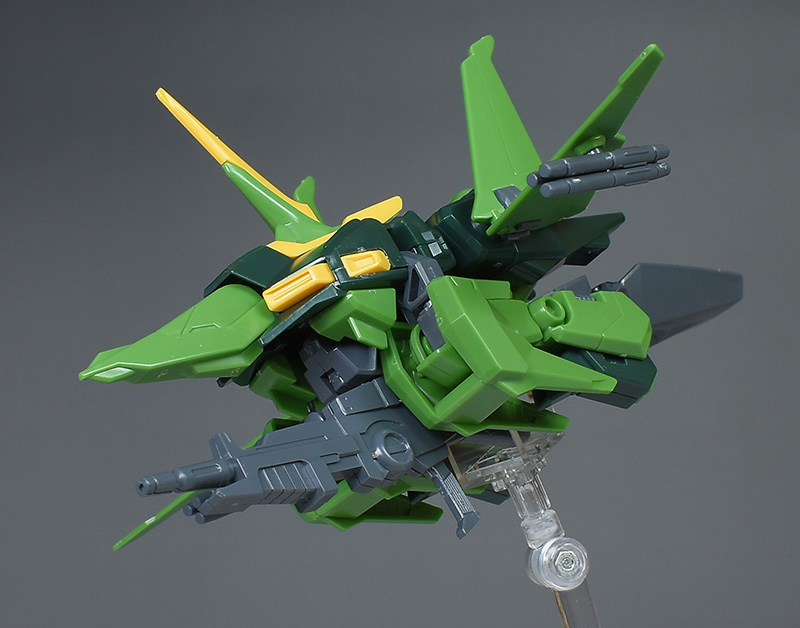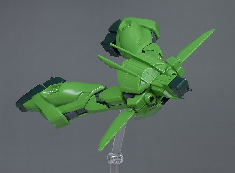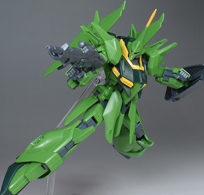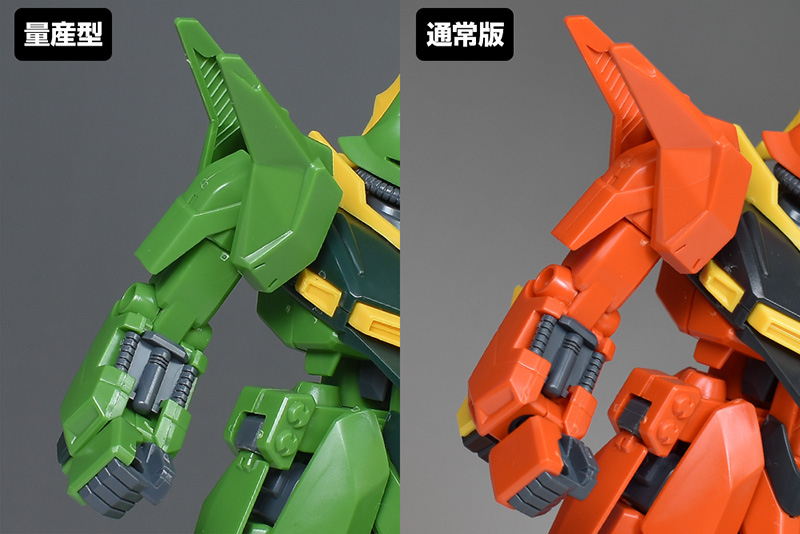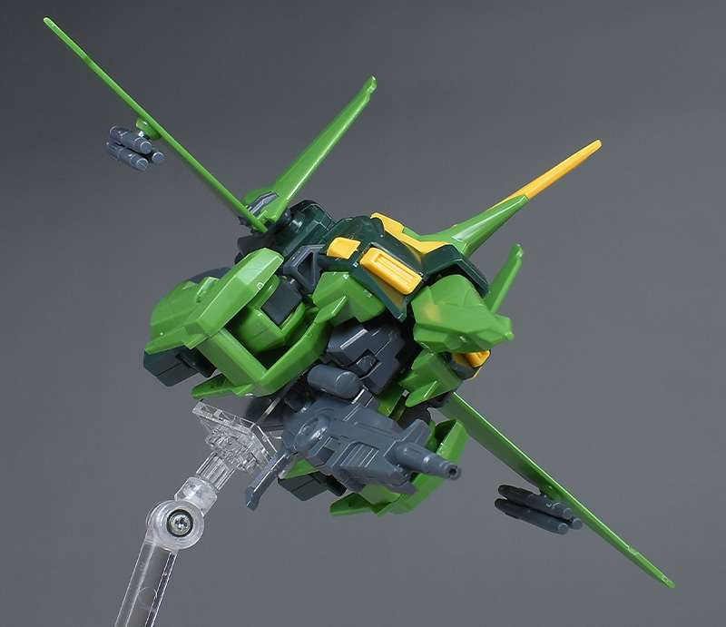 成形色ややや明るめのグリーンを基調に、胴体部やバックパック、ソール部にダークグリーン、頭部や胴体部、ビーム・サーベルなどにイエローを配色。その他、内部や関節、一部外装や武装類などがグレー成形色での再現となっています。