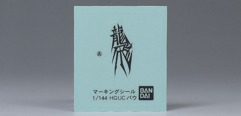 『龍飛』のマーキングシールが付属。HGUCバウのシールがそのまま流用されています。