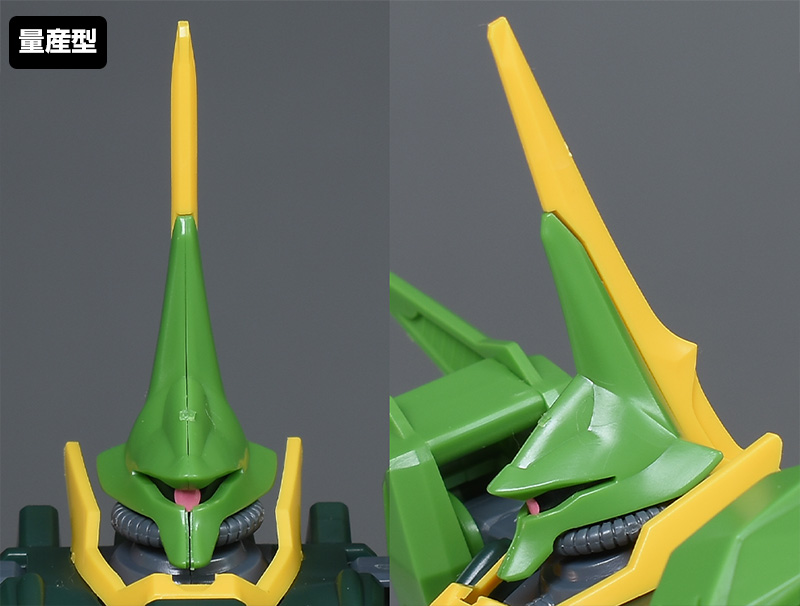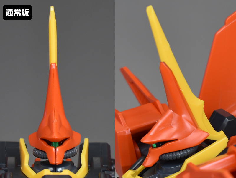 頭部を通常版と比較して。山型のシャープな装甲と後頭部の長いとさか状アンテナが特徴的に造形。バウらしい威厳を感じさせるデザインになっています。モノアイは通常のバウはグリーンですが、この量産型はピンクでの再現。