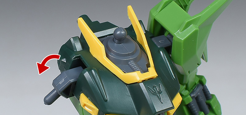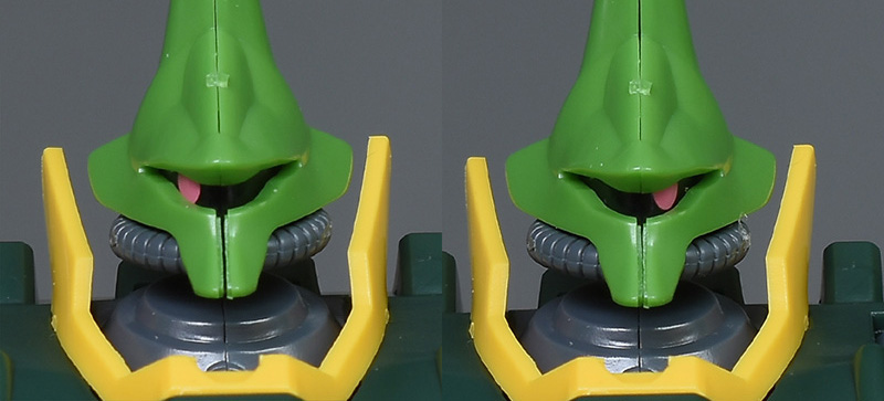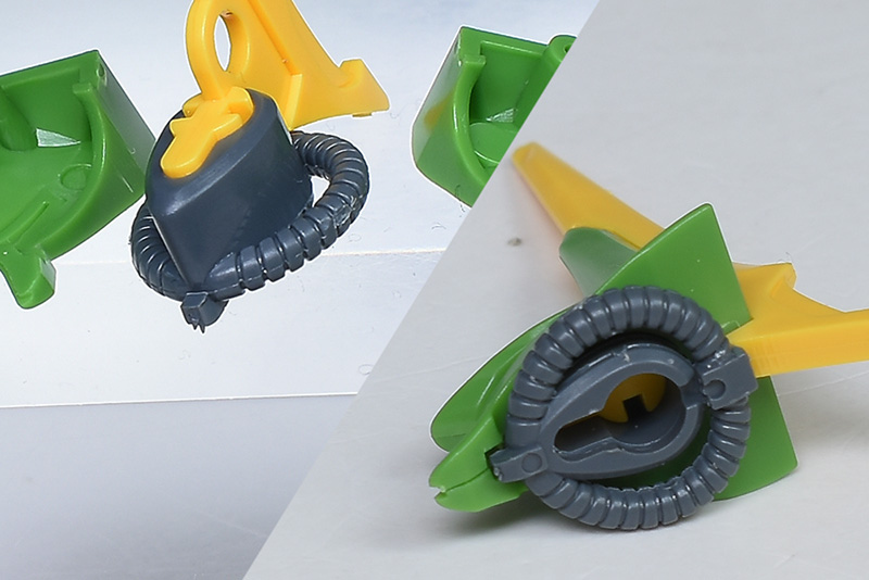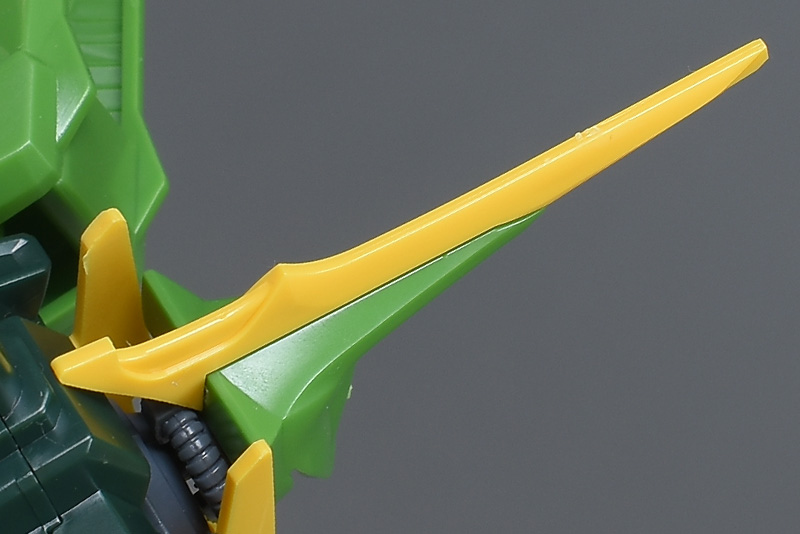 グリーンの頭部装甲は簡単な左右の組み合わせ。顎の部分は段落ちモールド化されていますが、ひさし上部などに合わせ目ができます。黄色いとさかを挟むため、合わせ目を消す場合は後ハメなどの加工が必要。