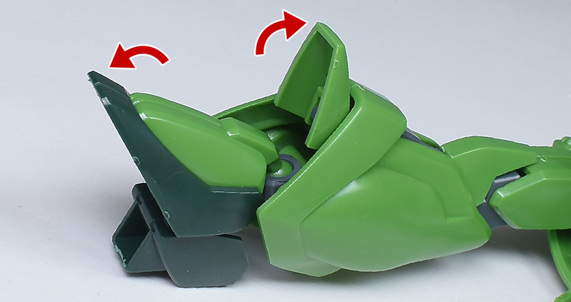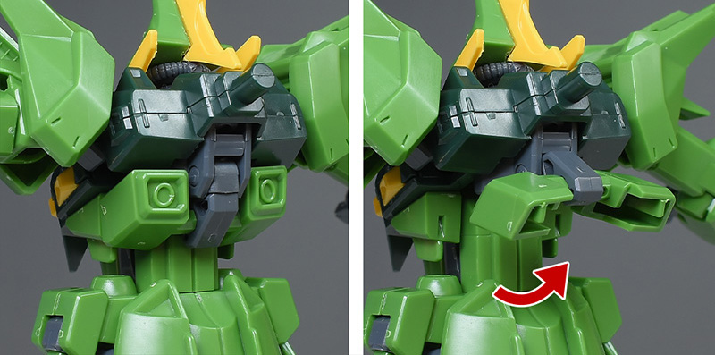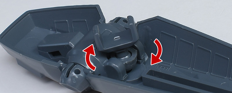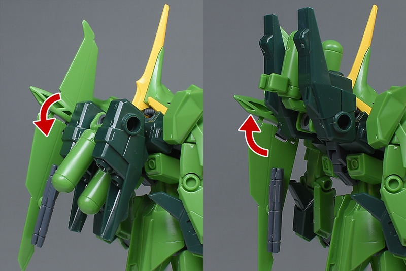 MA形態(バウ・アタッカー、バウ・ナッター)への変形は、まず背部バックパックを後方に展開し、バインダーの下側を左右に展開。背部の装甲を展開して下半身を引き抜きます。
