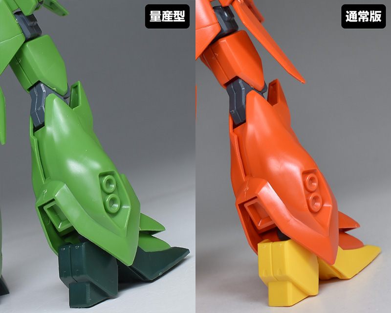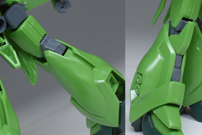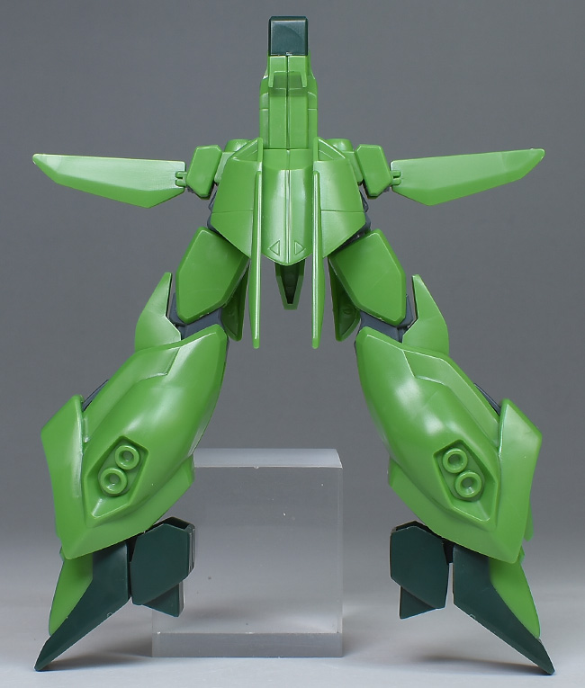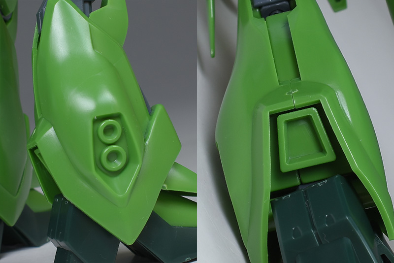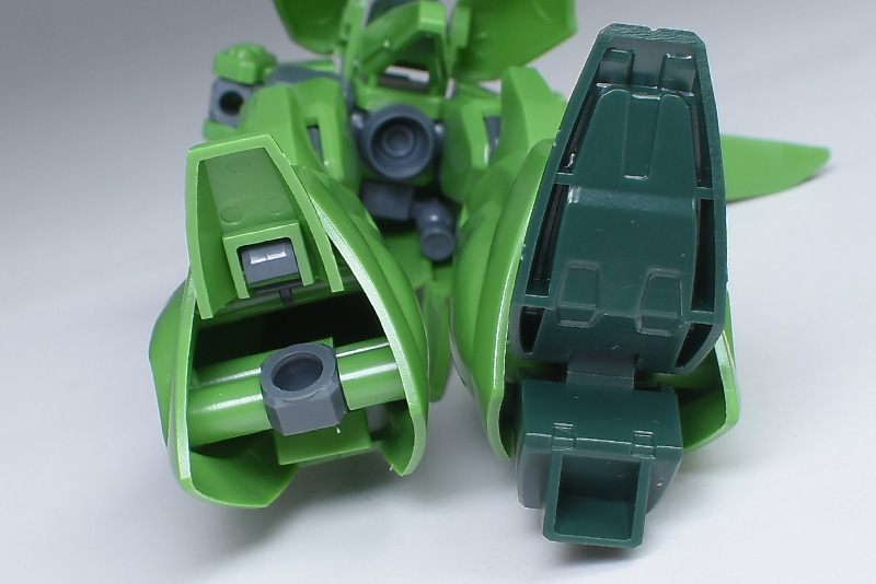 脚部。派手さはないですが、丸みとシャープさを併せ持つネオ・ジオン所属機らしいデザインで造形されています。大腿部は前後で微妙に形状が違っているので組み間違えないように注意。
