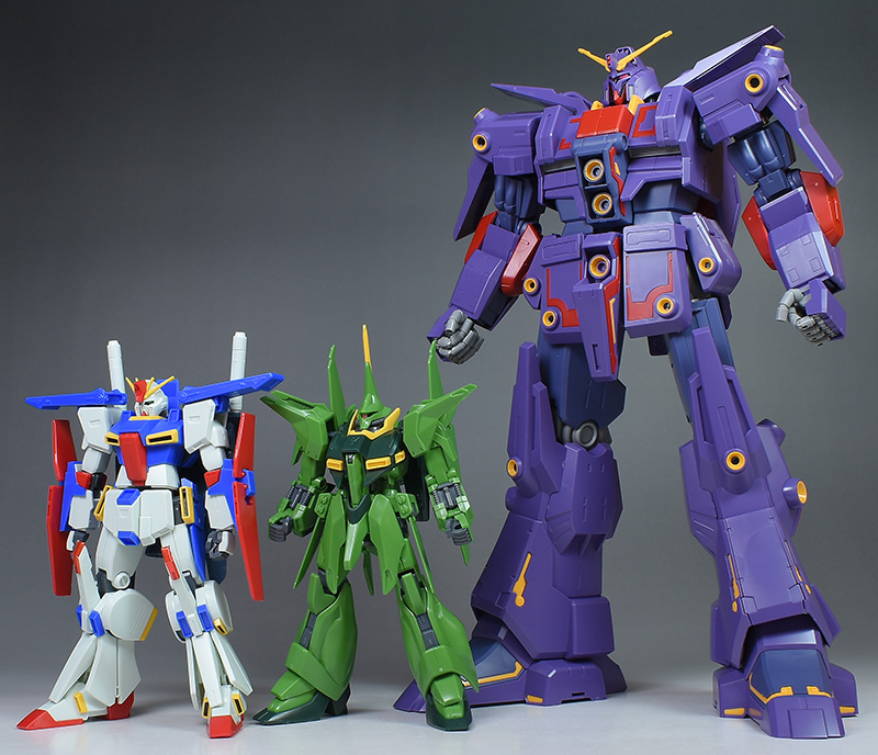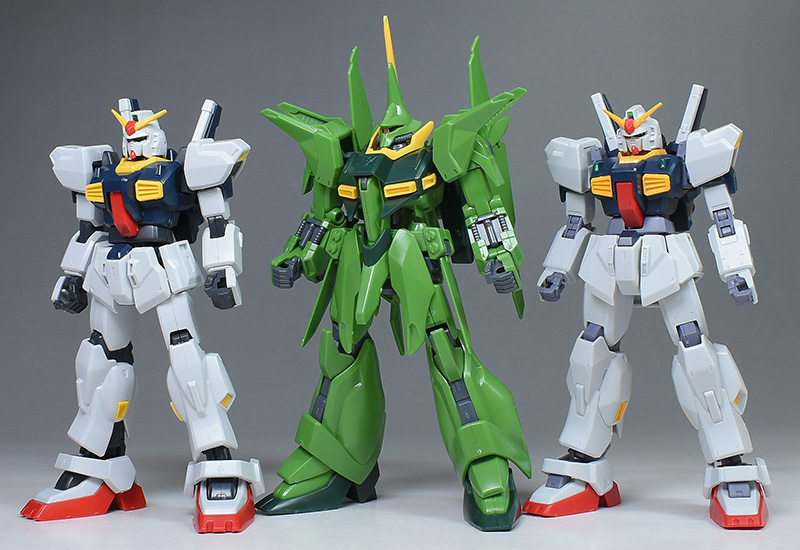 劇中で戦闘を繰り広げたMk-Ⅱ(リバイブ版、HGUCスーパーガンダム)と並べて。リバイブ版は映画版なのでマッシブ感があり、違和感を感じる人もいるかも。ZZをリアルタイムで見ていたファンにとっては旧版(スーパーガンダム)のほうが馴染みがあって良いかもですね。