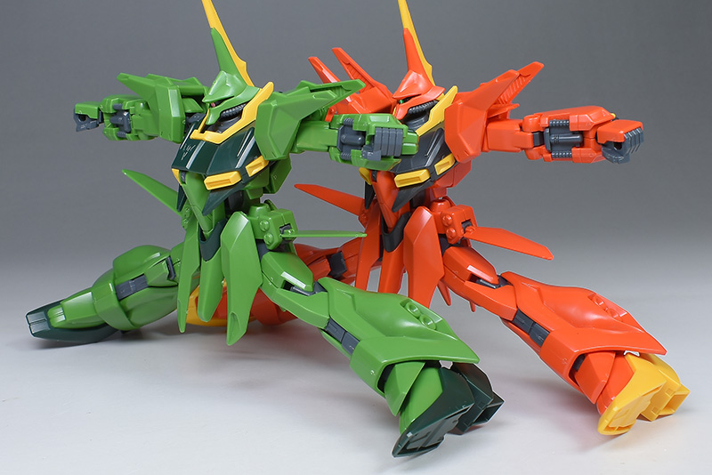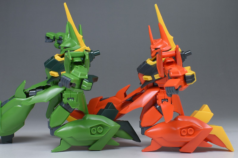 グレミー・トトが搭乗した赤いバウ(HGUC バウ:通常版)と並べて比較。成形色が異なるだけですが、赤とグリーンでは対象的なカラーリングでまた違った雰囲気があります。赤いほうは定番で馴染みがありますが、グリーンも新鮮味があって良いですね。