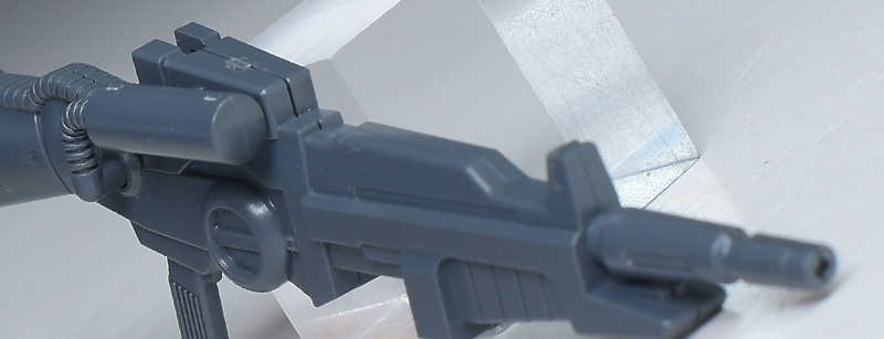 ビームライフルは後部ストックが長めで上腕と干渉しやすいので、ストックを脇に抱えるようにすると構えるのがラク。ポーズが格好良くなります。