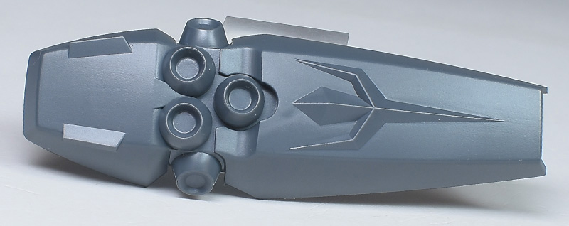 左右に配するスラスターユニット。簡単な3個パーツ構成で上下にガッツリ合わせ目ができます。後ハメなどは不要ですが、適度に凹凸があるので合わせ目消しは少し手間かも。後部の円形スラスター口はふちをイエロー、内部をグレーに塗り分けが必要です。