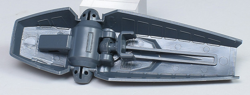 シールド。実体式の盾です。表面にはネオ・ジオン軍の紋章のレリーフモールドが造形。中間部には5門のメガ粒子砲が造形されていますが、内部は詰まった状態で造形的にはあっさりめ。内部は黒、ふちはレッド、レリーフはイエローに塗り分けが必要です。塗り分けるとかなり雰囲気が良くなりそう。