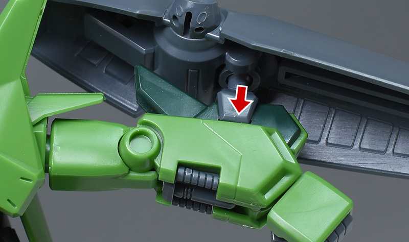 シールドはジョイントパーツを前腕にカチッと組み付けて固定します。しっかりはまり込むため、ポロリなど無く取り回しがラク。ジョイントパーツもボールジョイントとポリキャップで柔軟に可動するため、腕部との干渉を避けることができます。