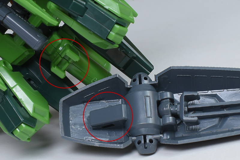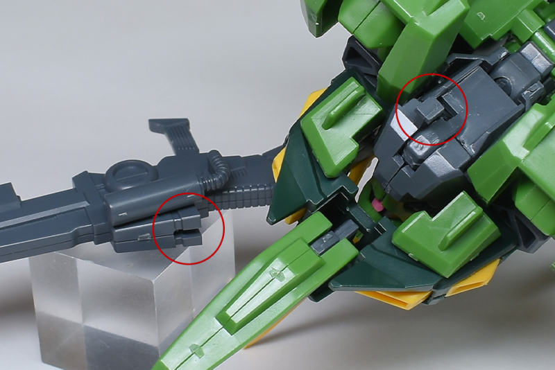 ビームライフルもシールドも底面のジョイント(赤◯)にかっちりと組み付けることができます。