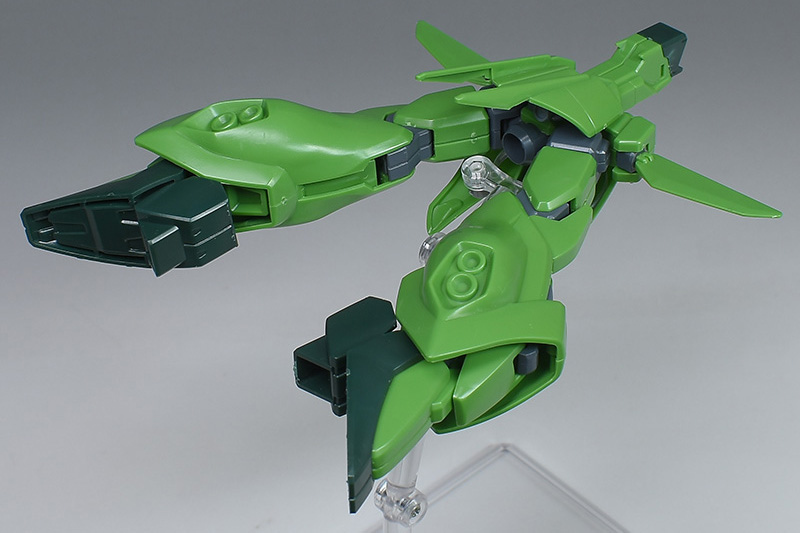 バウ・アタッカーも浮かせてディスプレイできるようになっていないので、アクションベースに付属のコの字パーツに乗せているだけです。不安定なのであまりおすすめはできませんが、MA形態の飛行ポーズは様になりますね。
