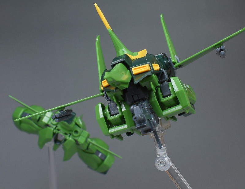 バウ・アタッカーとバウ・ナッターを組み合わせて飛行シーンを再現。劇中では一切変形していないので、キットでは思う存分に変形やバウ量産型のMA形態を楽しみたいですね。