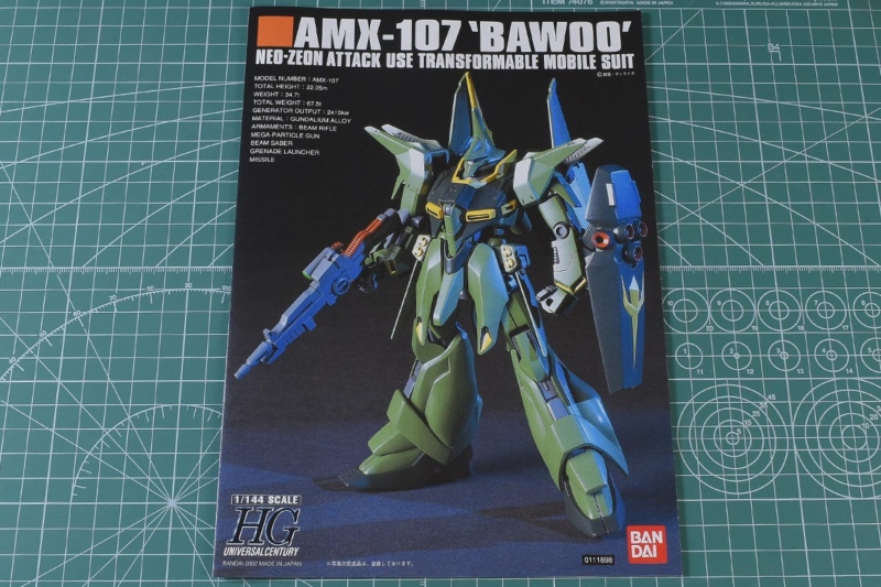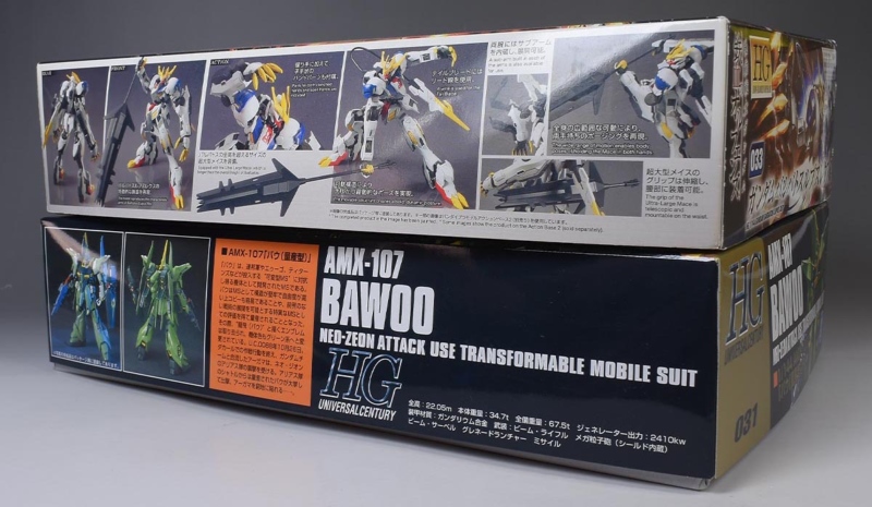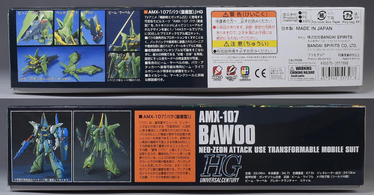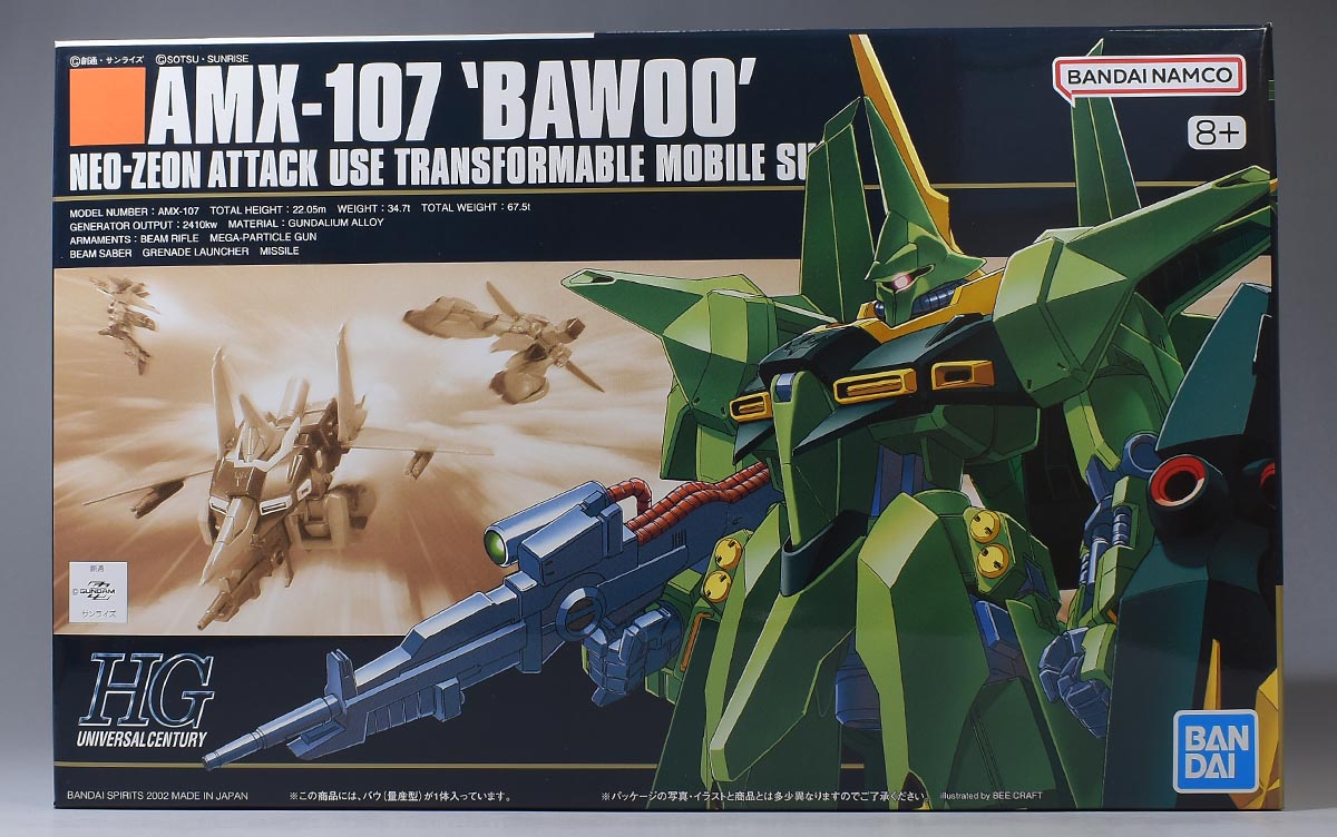 パケ絵はHGUCフォーマット。ですがかなり前のキットなので、手前のバウ(量産型)のイラストはアニメ風。更に上半身のみの掲載となっています。背景はバウ・アタッカー、バウ・ナッターに分離して飛行する様子が描かれていますが、アニメ劇中では分離変形をしていないのでイメージかと。もしくは何か別作品でのワンシーン?
