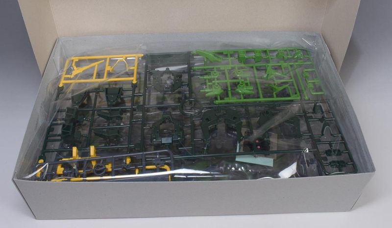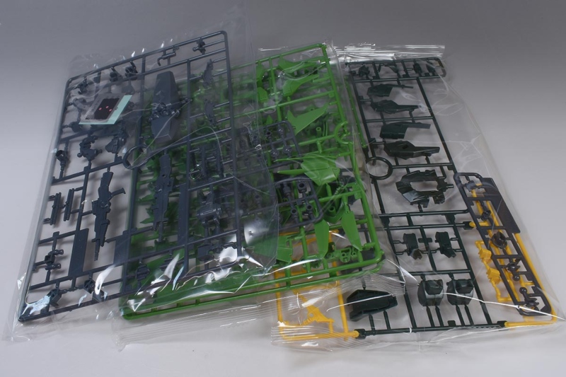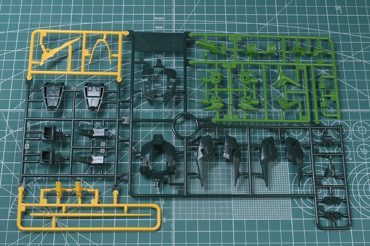 ↑A1ランナー。ダークグリーン、イエロー、グリーンのイロプラランナーで、頭部や胴体部、腕部、ソール部、背部スラスターパーツなど。