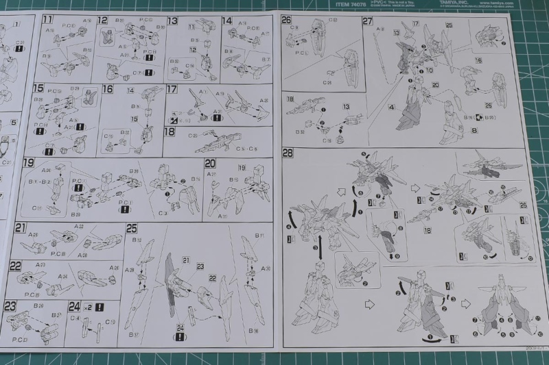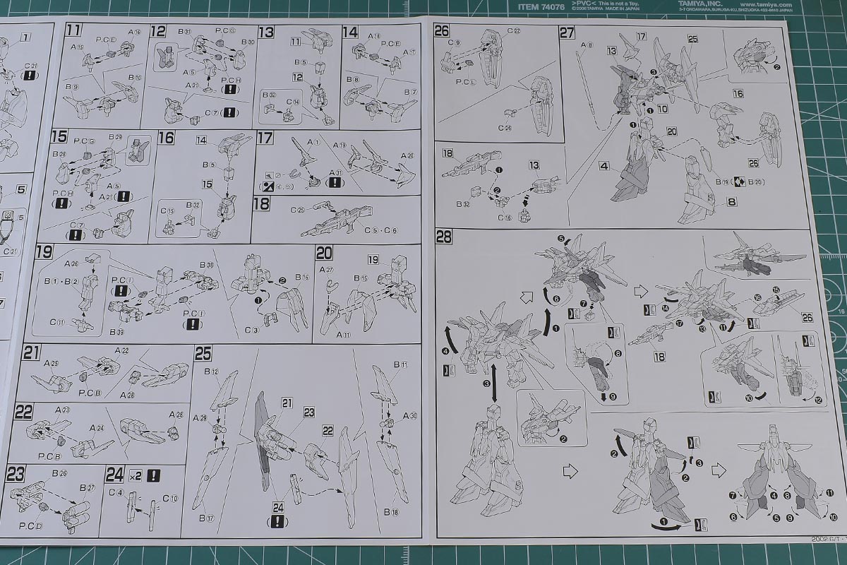 以上、説明書でした。ある程度簡単なモナカ仕様の箇所はあるものの、今から20年以上前のキットながら合体変形がかなり詳細に再現されていると思います。上下が合体した状態でも強度高く連結されていますし、分離しての個別形態もプロポーションが破綻することなく忠実に再現されています。これでスタンドでのディスプレイも考慮されていると完璧だったんですけどね;