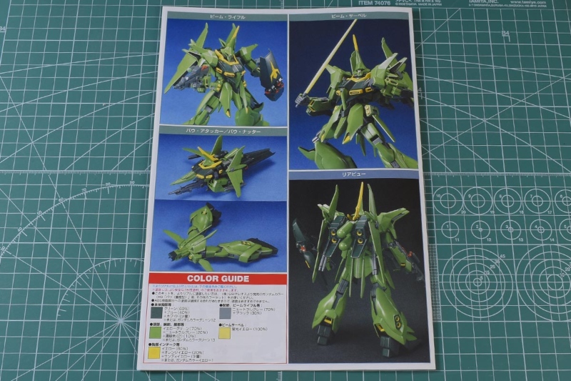 説明書。HGUCフォーマットの大判B5サイズです。表紙は塗装済みキット画像。細部や武装類がしっかり塗装されているのと、全体のグリーンも成形色よりも深いのでかなりよく見えますね。