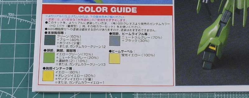 カラーガイド。調色はまずまずです。外装のグリーンが少し明るめに感じるので、もう少し深みのあるグリーンで塗装したいところ。各部ダクトはグリーン成形色にイエローなどを塗る必要があるので、発色を促すためにも下地塗装はしたほうが良いかなと思います。