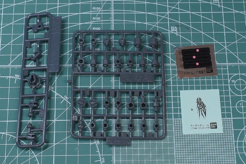 ↑A2ランナー、ポリキャップ(PC-123プラス)、ホイルシール、マーキングシール。A2はグレー成型色で、頭部や胴体部、背部バインダー基部など強度が必要な箇所のパーツ。ABS素材です。