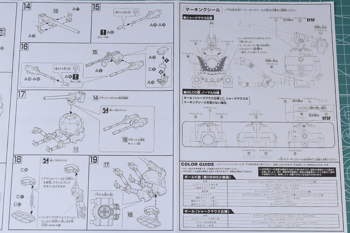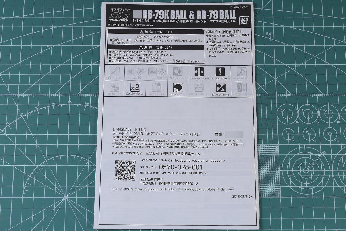 説明書もプレバン仕様で表紙などはありません。シンプルな白黒仕様。パーツリスト、組立方法、マーキングガイドが掲載された簡易的なものです。小判A5サイズで通常のボールツインセットと同じ大きさ。HGUCジムも小判でしたが、MSの格みたいなもので分けられていたりするんですかね;ちなみにヅダは大判でした。