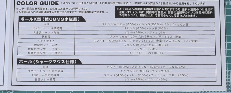 カラーガイド。そこまで複雑ではないですが、K型のほうは少し色種が多め。ヘッドライト部分など細部の塗装が必要なので少し手間がかかると思います。全体的には合わせ目がそこそこあるので処理に時間がかかりそう。シャークマウス仕様については公式から水転写デカールは発売されていません。なのできれいに仕上げたい場合は自作か◯◯版に頼るか・・・。