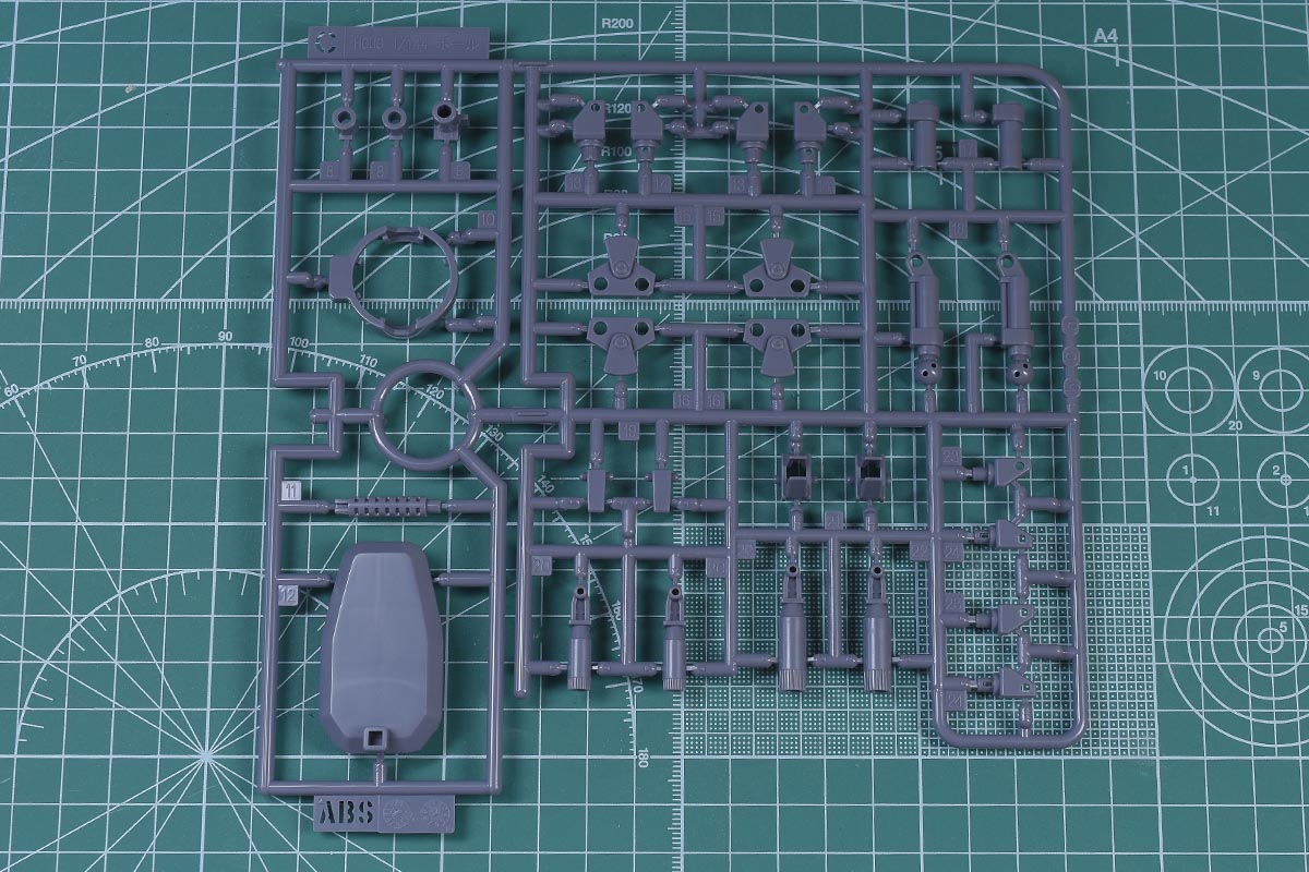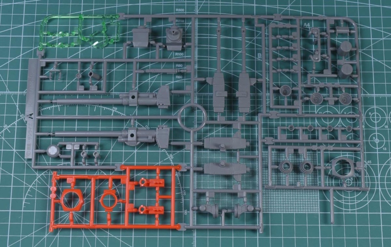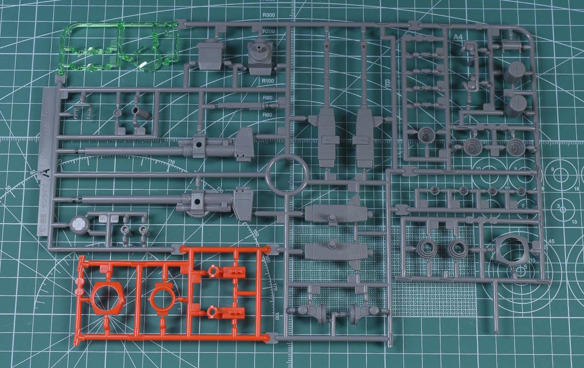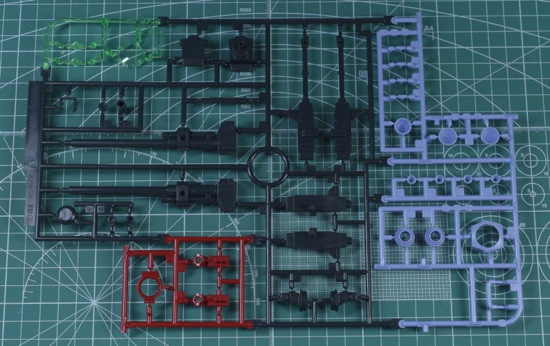 ↑Aランナー。グレー、レッド、クリアグリーンのイロプラランナーで、コントロールブロックの前面ハッチや下部のバーニア、180ミリ低反動キャノン砲、連装式フィフティーンキャリバーパーツなど。HGUCボールツインセットからの流用ですが、右側にK型用のパーツが追加されています。