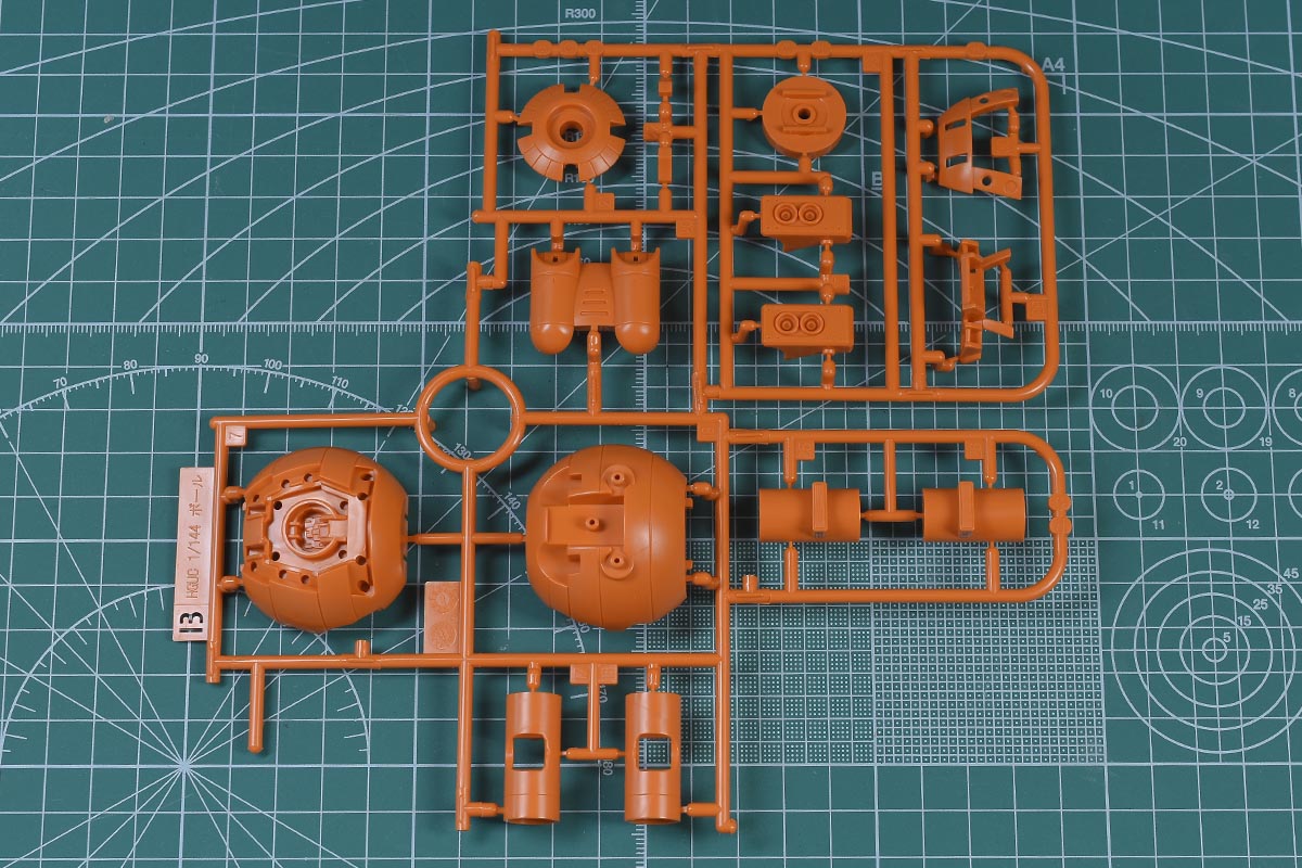 ↑Bランナー。オレンジ成形色で、コントロールブロックや背部スラスター、アーム基部パーツなど。HGUCボールツインセットからの流用ですが、左側と下の通常版用パーツが省かれ、右側にK型用のパーツが追加されています。