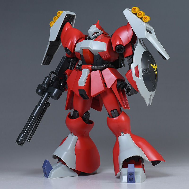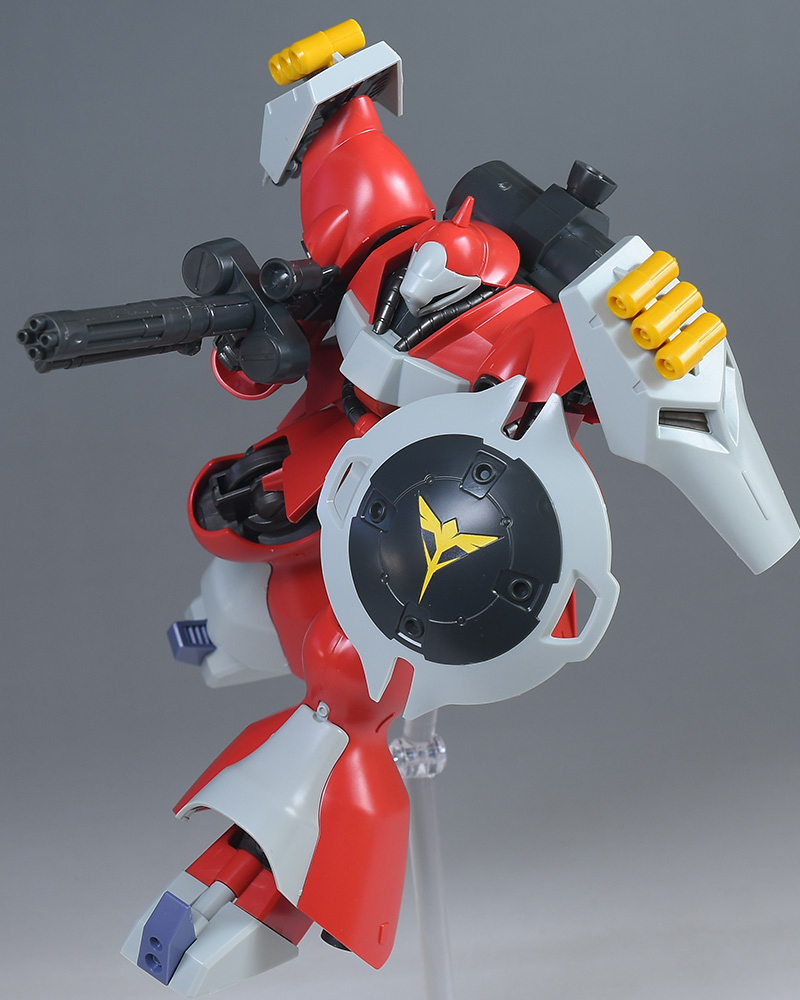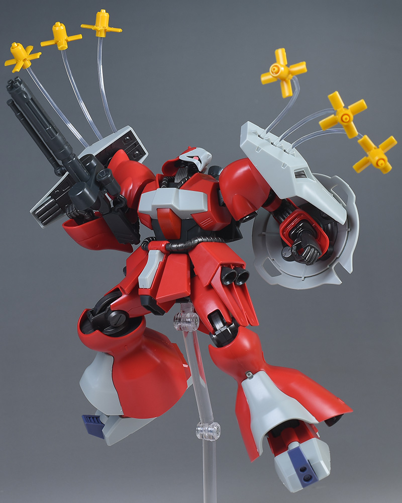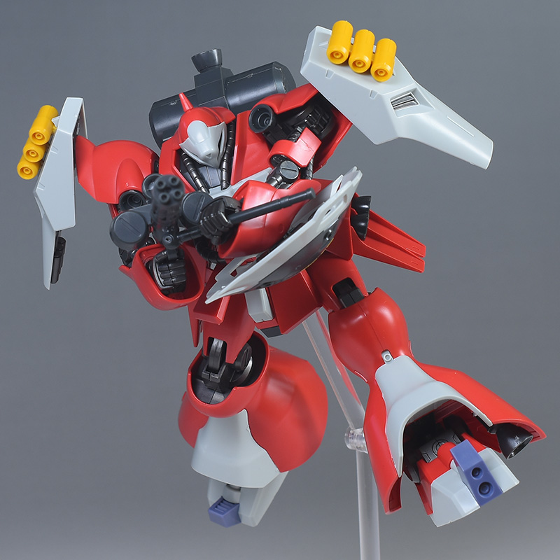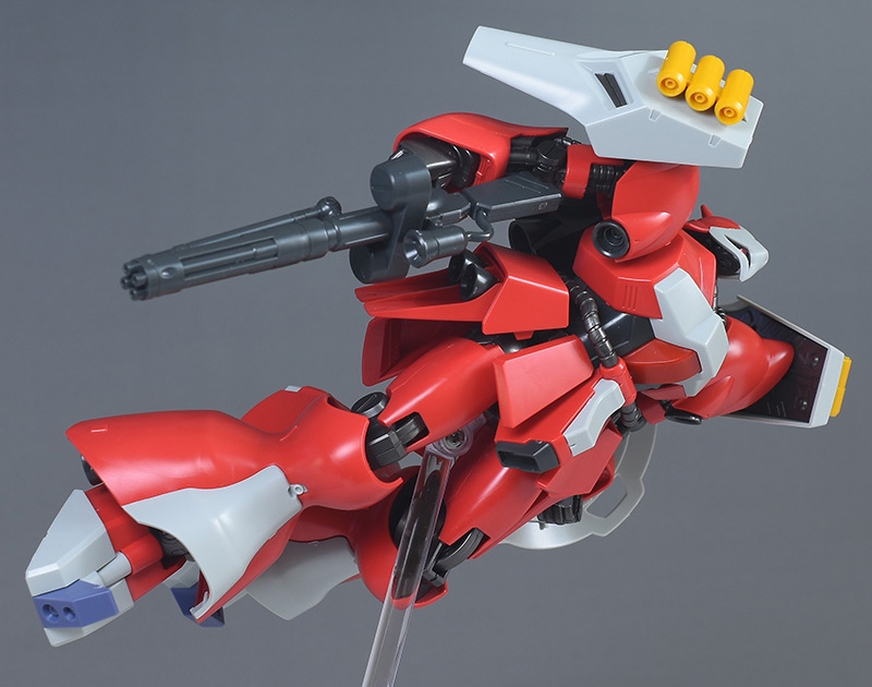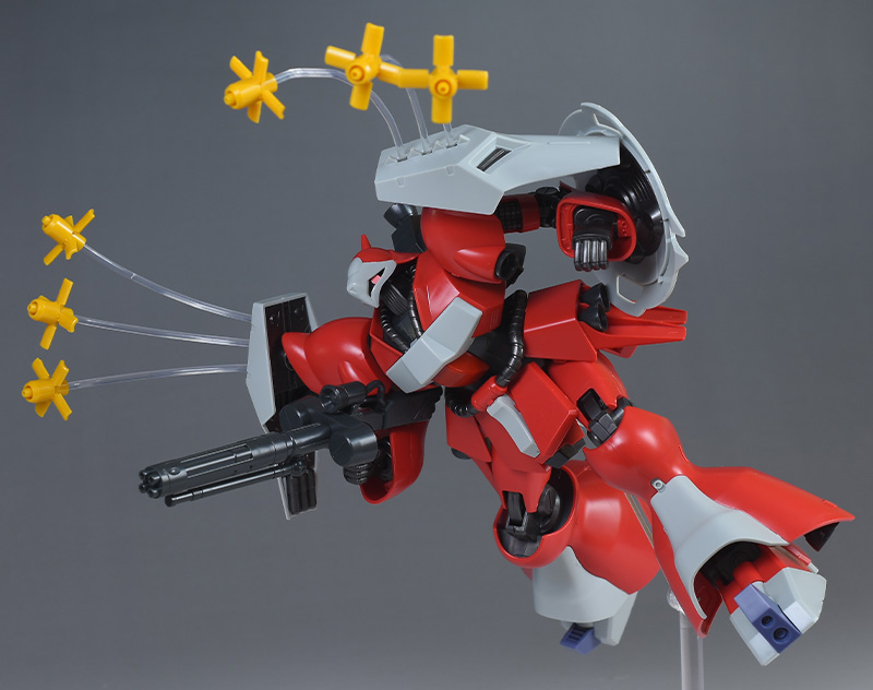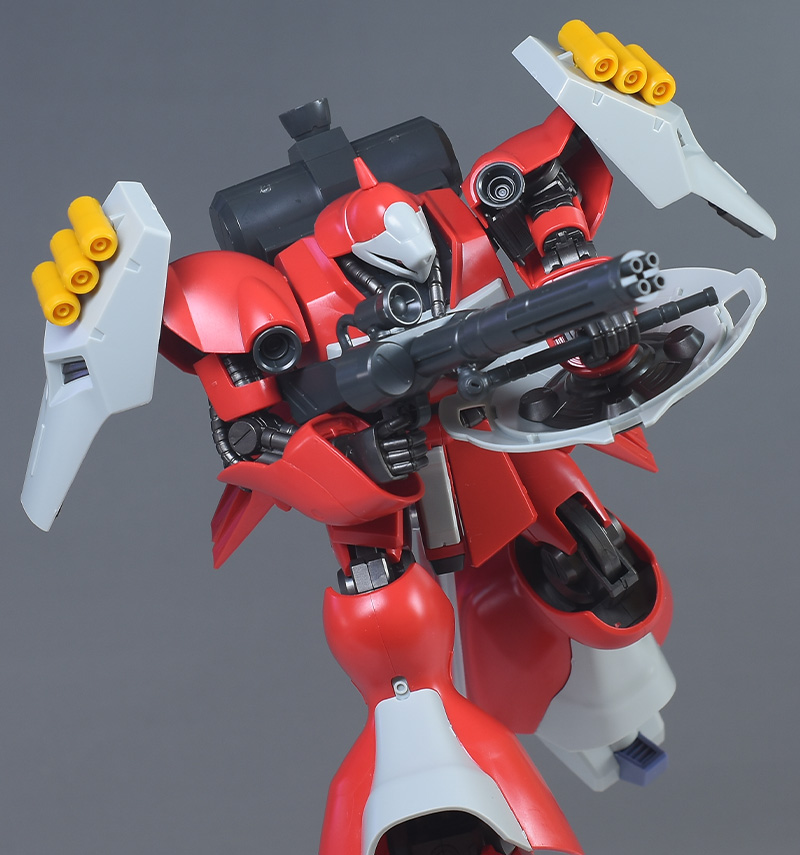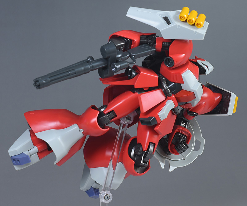 同日発売のHGUC ヤクト・ドーガ(ギュネイ・ガス専用機)と形状は殆ど同じですが、クェス・エア専用機特有の赤を基調としたカラーリング、頭部装甲やメガ・ガトリングガンが新規造形で再現されています。
