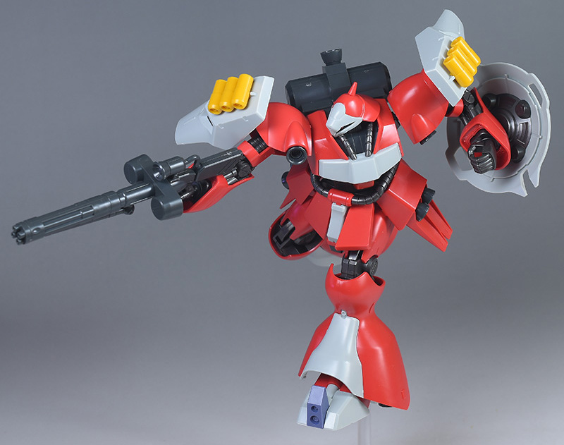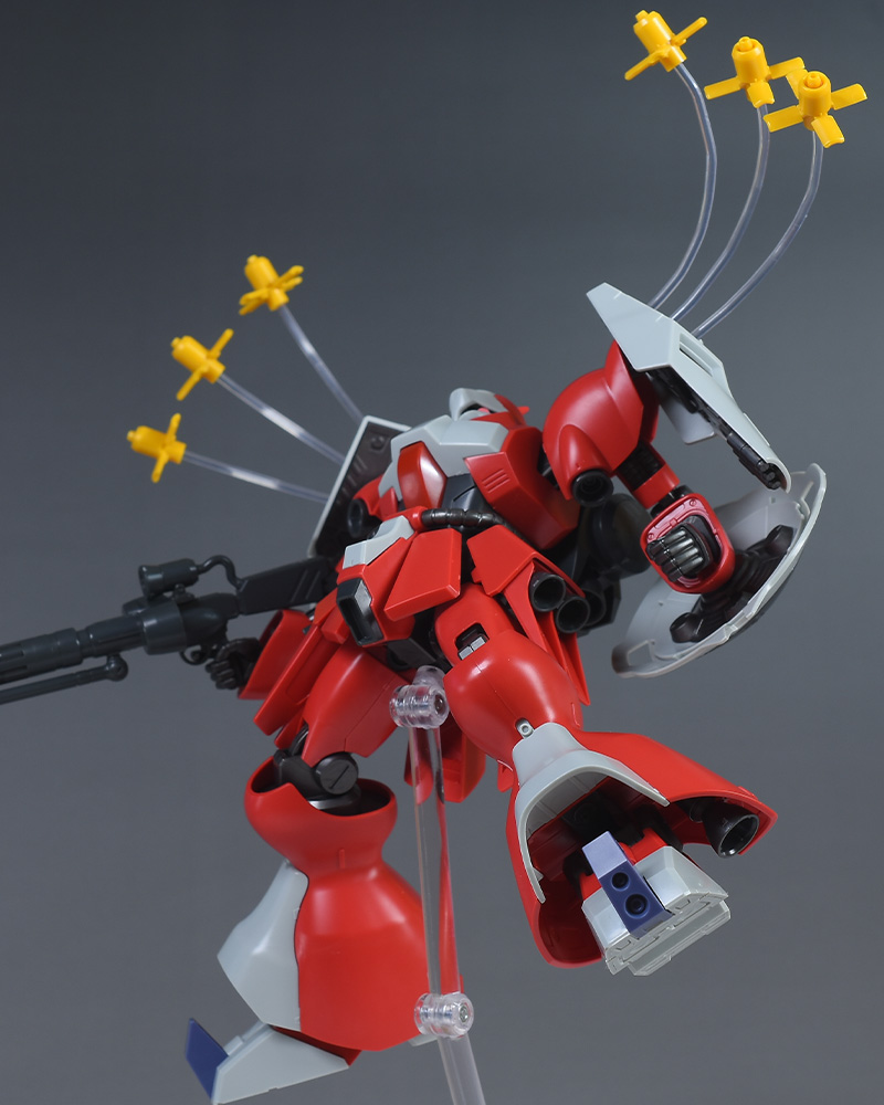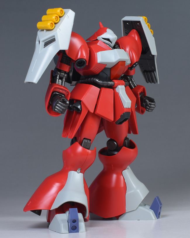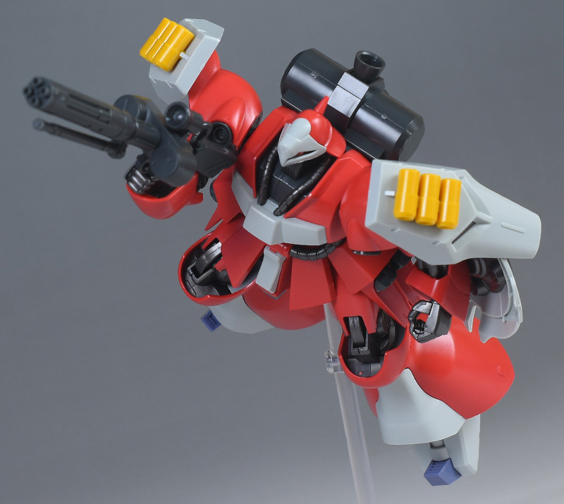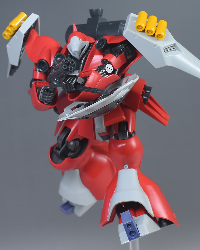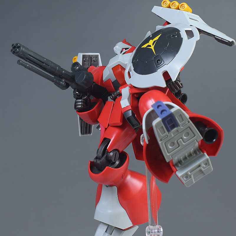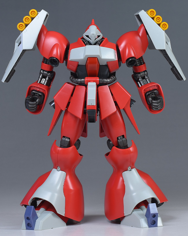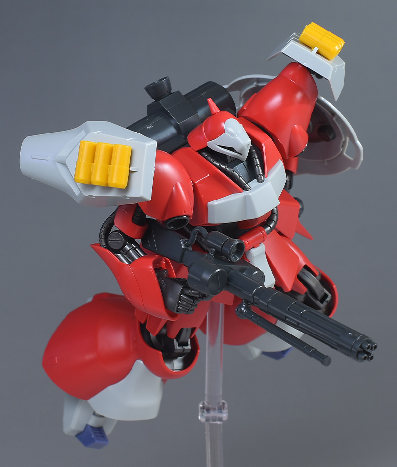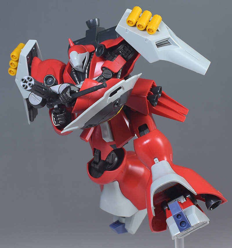 同日発売のHGUC ヤクト・ドーガ(ギュネイ・ガス専用機)と形状は殆ど同じですが、クェス・エア専用機特有の赤を基調としたカラーリング、頭部装甲やメガ・ガトリングガンが新規造形で再現されています。