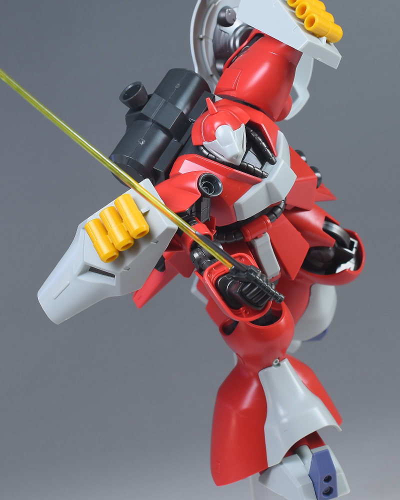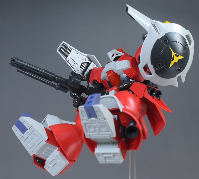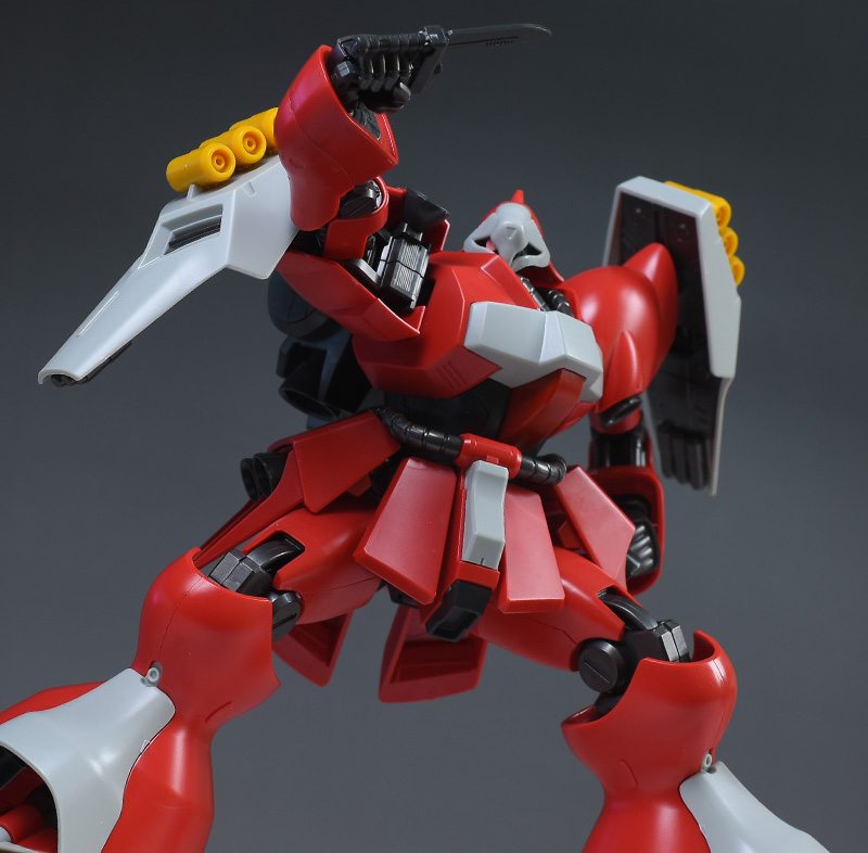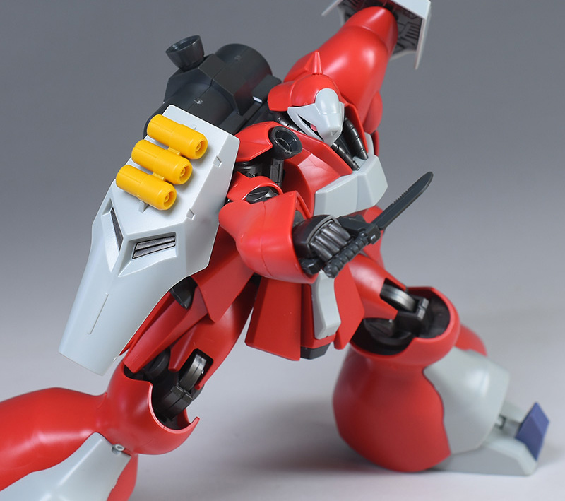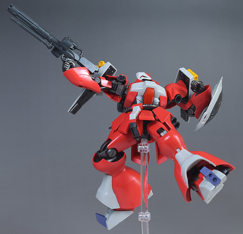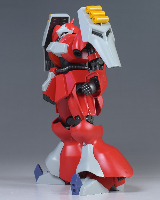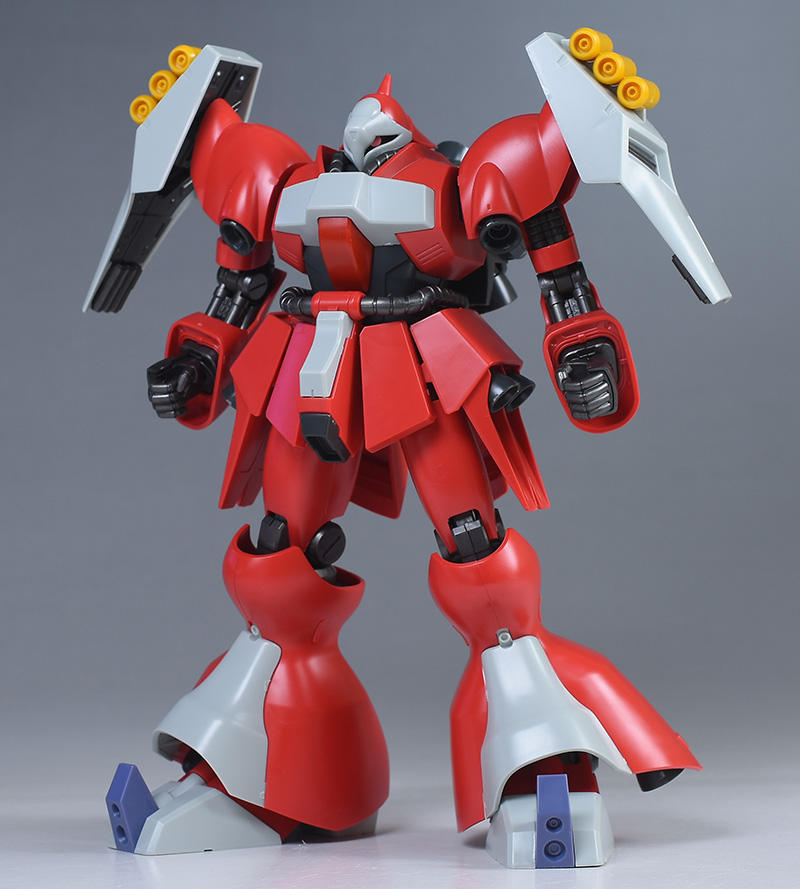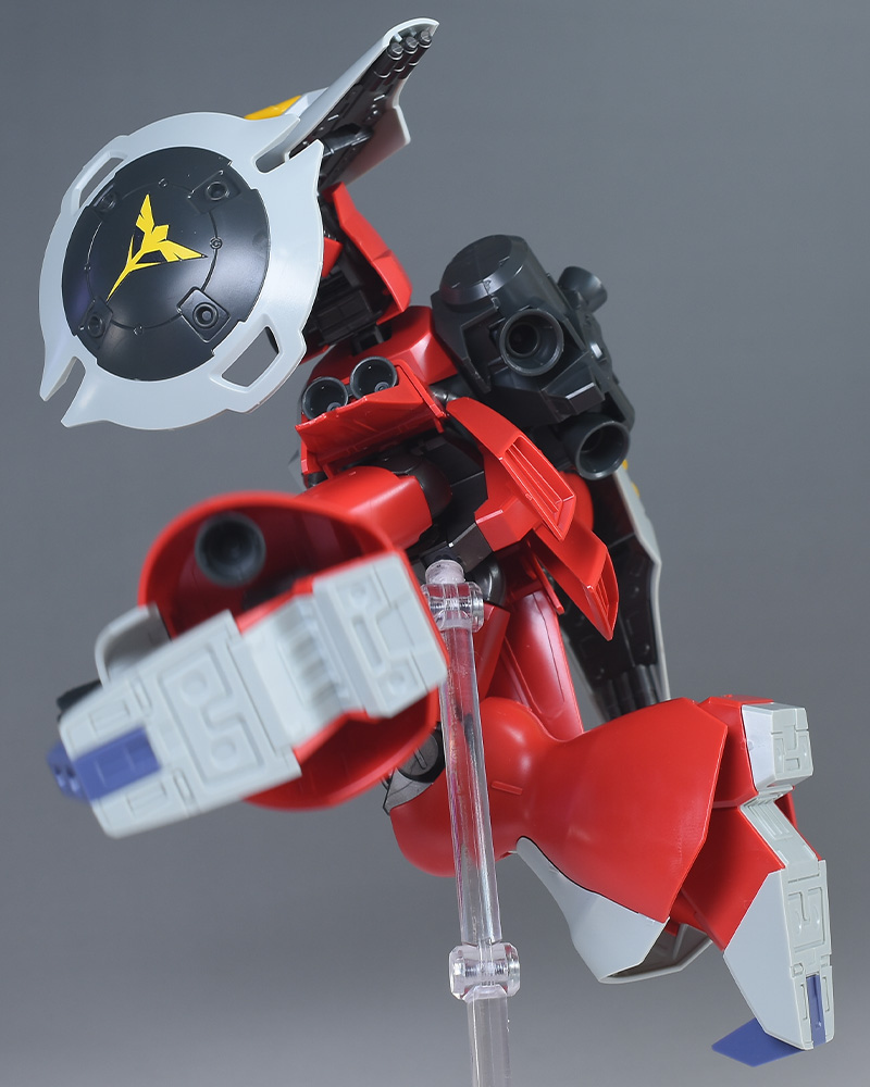 同日発売のHGUC ヤクト・ドーガ(ギュネイ・ガス専用機)と形状は殆ど同じですが、クェス・エア専用機特有の赤を基調としたカラーリング、頭部装甲やメガ・ガトリングガンが新規造形で再現されています。