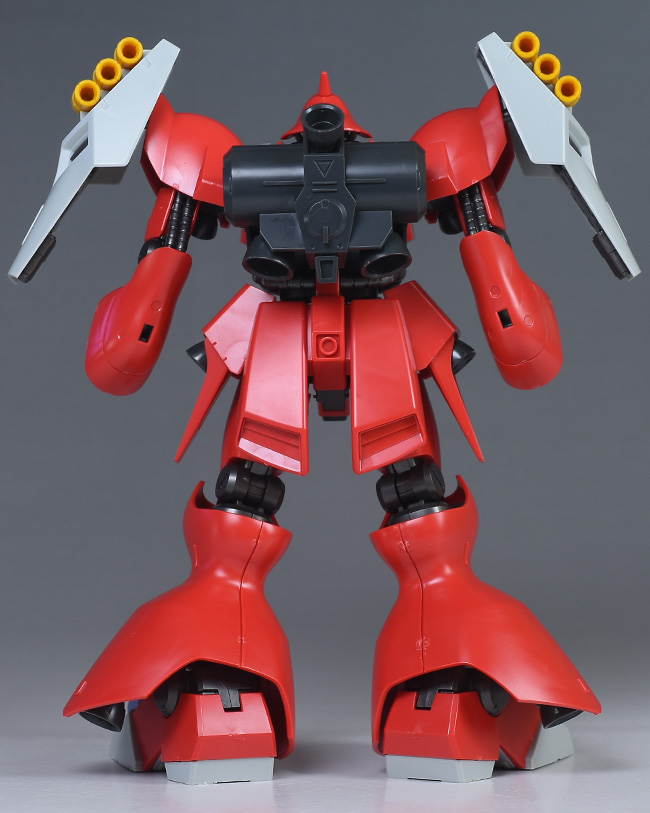 ホイルシールが付属しますが、モノアイとシールドのネオ・ジオンマークを補うくらいでわずか。つま先や各部バーニア内部、メガ・ガトリングガンのセンサーなど細部を塗り分ける必要がありますが、素組みでも十分なくらいの色分けが再現されています。