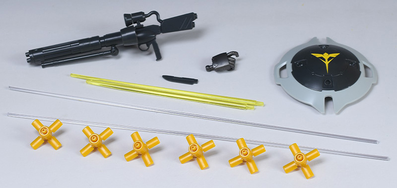 メガ・ガトリングガン、メガ粒子砲内蔵シールド、武器持ち手、ファンネル(展開状態)✕6、ビーム・サーベル刃(長短)、クリアの軟質クリア棒✕2が付属。