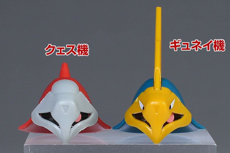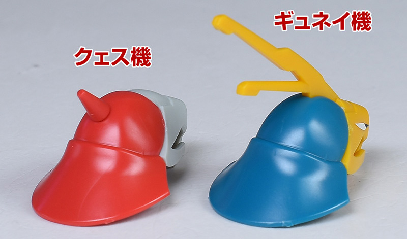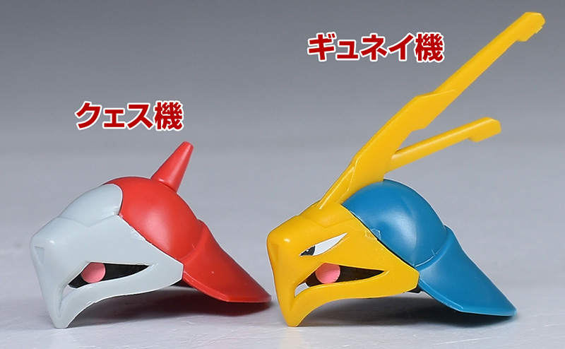 頭部をギュネイ機を並べて比較。大部分の形状やシルエットはかなり似ていますが、フェイスやメット部パーツなどがクェス機用に新造。女性キャラクターの搭乗機をイメージしてか、アンテナやノーズアートがなく落ち着いたデザインになっています。