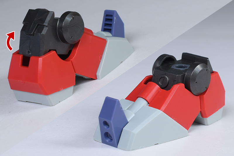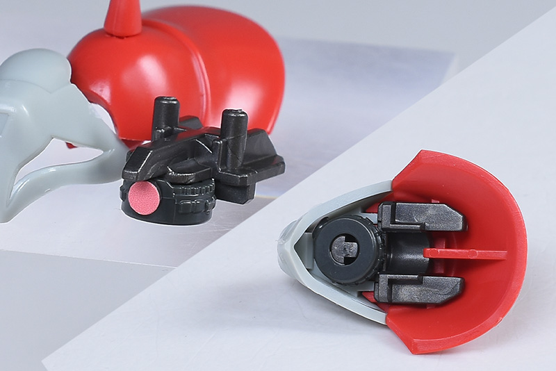 本体部分は簡単な前後の組み合わせで上部などに合わせ目ができます。下部バーニアはポリキャップ穴への1軸接続で適度に前後に可動。表情を変化させることができます。バーニアは各部とも別パーツ化されていますが、本体と同一成形色なのでシルバーなどに塗り分けたりすると映えそうですね。