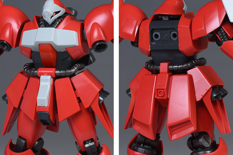 成形色はレッドを基調に、頭部や胸部、肩部腰部、脛部など各部にライトグレーを配色したクェス機カラー。その他は腹部やバックパック、武装類がダークグレー、両肩のファンネルがイエロー、つま先がパープルグレー、内部や関節がメタリックグレー成型色での再現となっています。