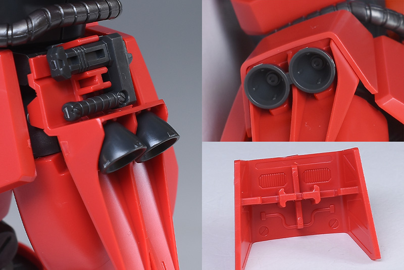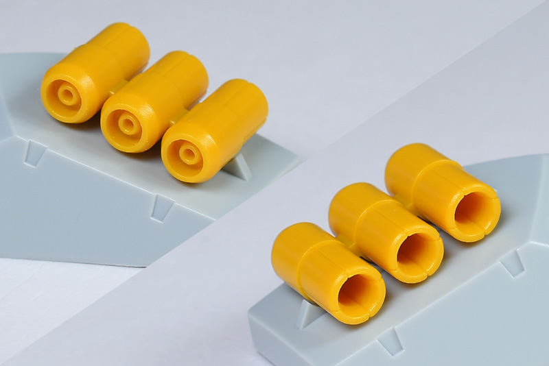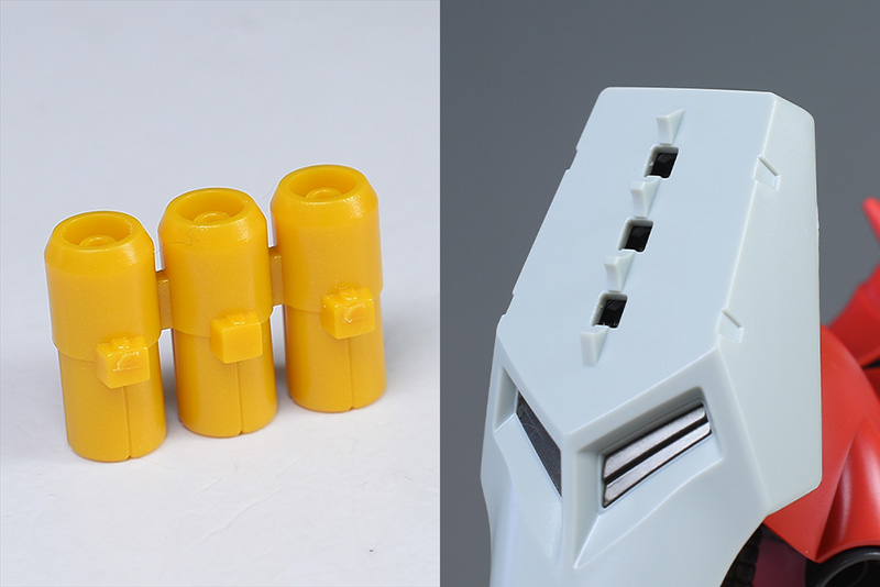 ファンネルは1個パーツ構成で3基一体となっています。個別にダボがあるので、切り離して個別化してみても面白いかと。