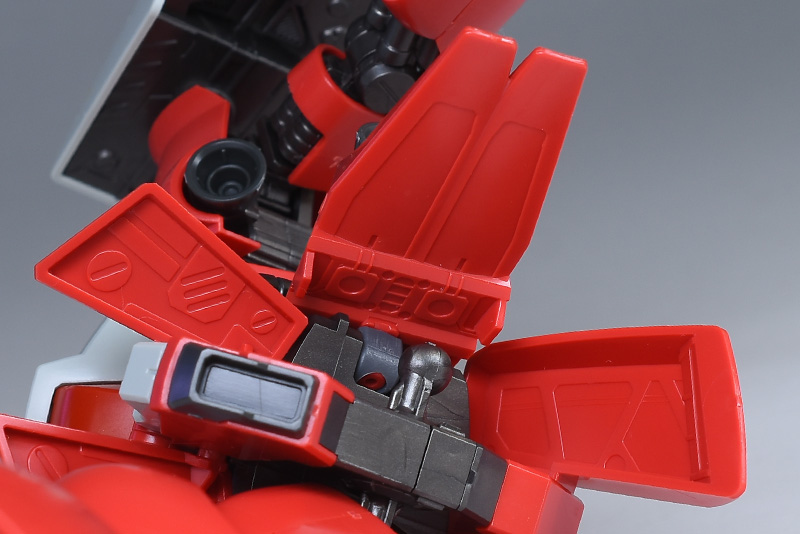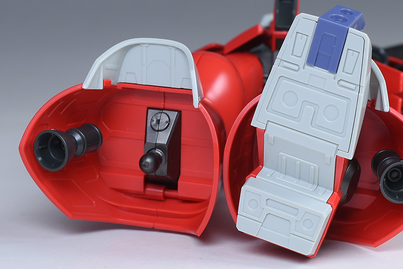 サイドアーマーの装甲は取り外しが可能。左のサイドアーマーにはヒートナイフ付きビーム・サーベルが収納されていて、取り出して付属のパーツ、ビーム刃パーツと組み合わせることで武装として使用することができます。柄は左側にも収納可能。装甲パーツの内側にもメカニカルなモールドが造形されていて何気に造りが細かいです。バーニア内部は赤く塗り分けが必要。