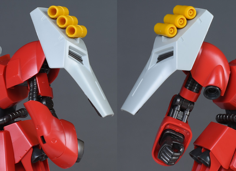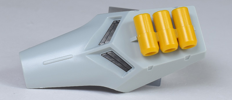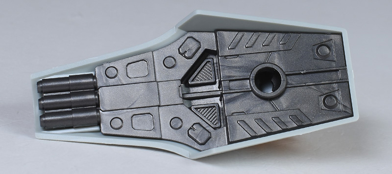バインダー(ファンネル・ポート・シールド)自体は簡単な2枚パーツ構成。ですが裏打ちパーツが造形されているため、裏面からの見た目もメカニカルで映えるものになっています。先端には3本のミサイルが造形されていますが、特に脱着ギミックなどはありません。
