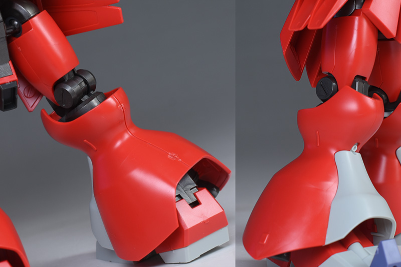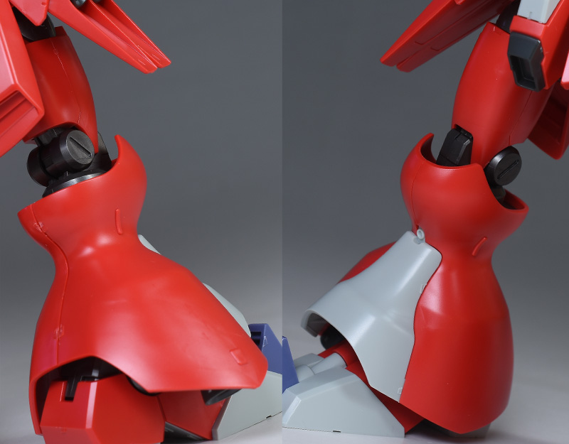大腿部は前後の組み合わせですが、側面の合わせ目はモールドっぽく造形。膝から下は左右と脛装甲の組み合わせで前面の膝に合わせ目ができます。合わせ目を消す場合は後ハメなどの加工が必要。なかなか厳しい部分に合わせ目がありますね;後部は段落ちモールド化されています。