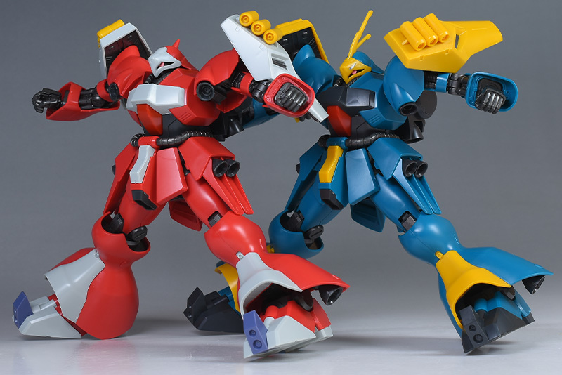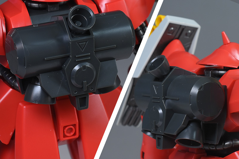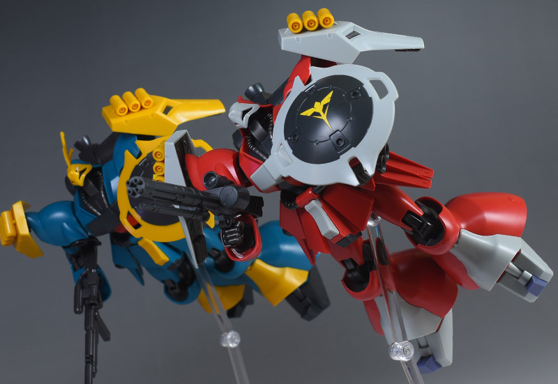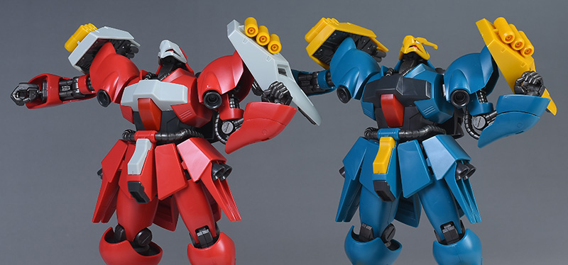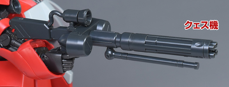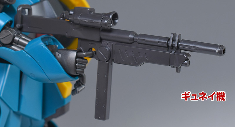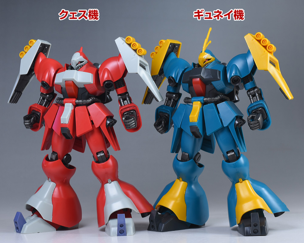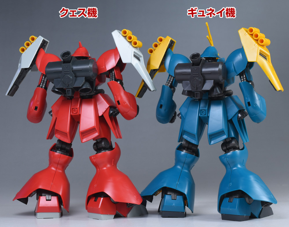 武装はギュネイ機がビーム・アサルトライフル、クェス機がメガ・ガトリングガンで全く異なる武装を装備しています。カラーリングを含め、しっかりと差別化できているのが良いですね。