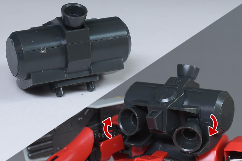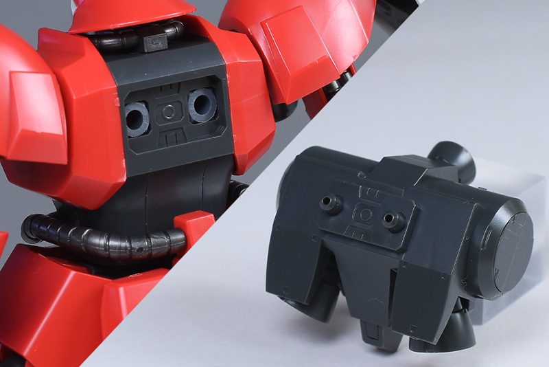 バックパックと本体とはポリキャップを交えた2ダボ接続。角型の装甲が組み合わさるため、しっかりと固定させることができます。ダボ幅が異なるため、他キットのバックパックは装備できずでした。