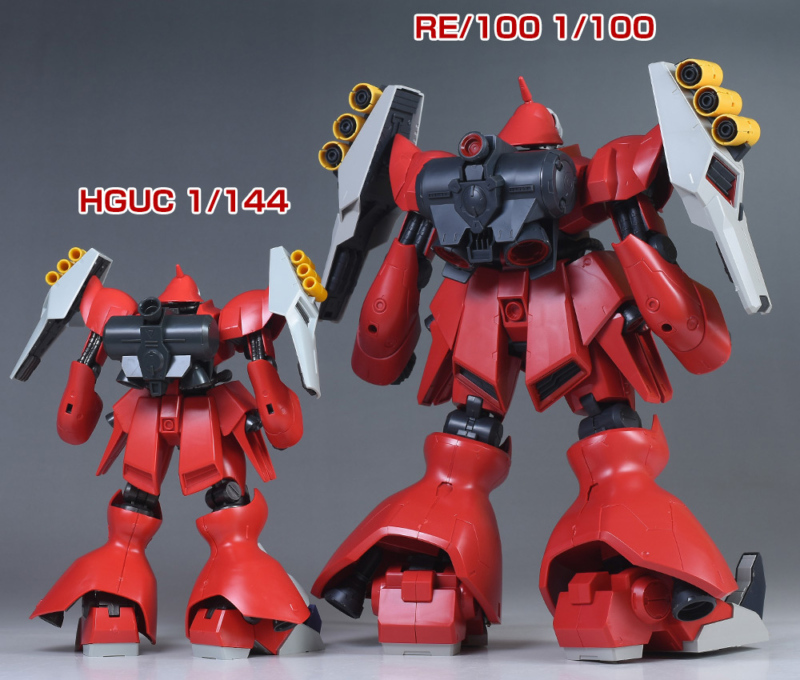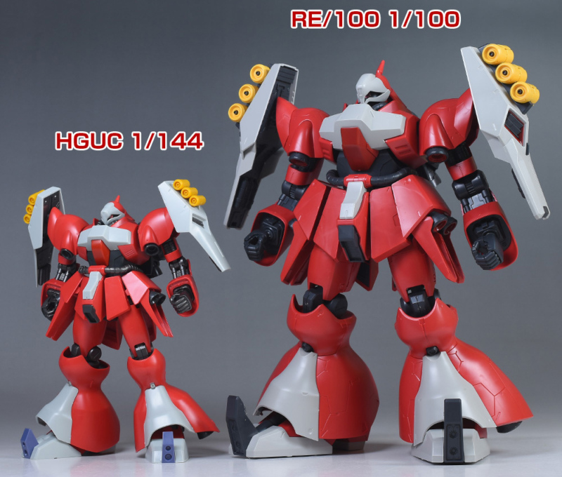 RE/100ヤクト・ドーガ(クェス・エア機)と並べて。プロポーションはそんなに差はなさそうですが、1/144と1/100なのでキットの大きさにはかなり差があります。1/100のヤクト・ドーガはデカいですね。