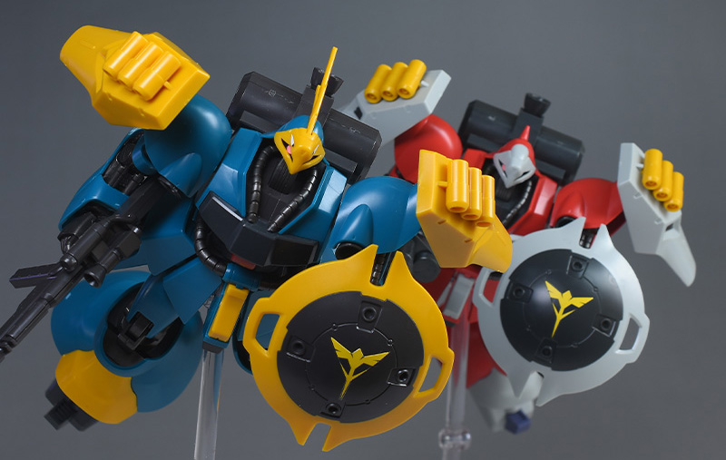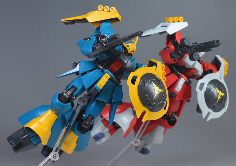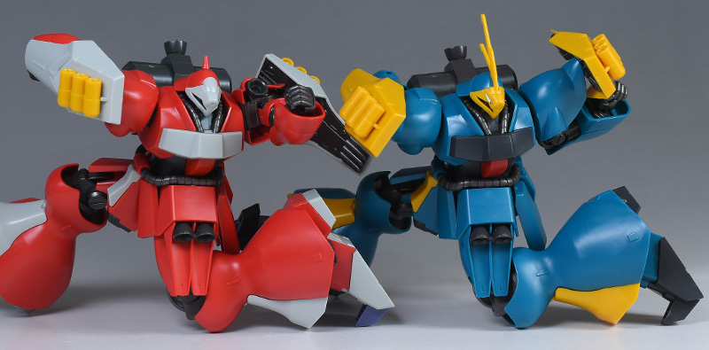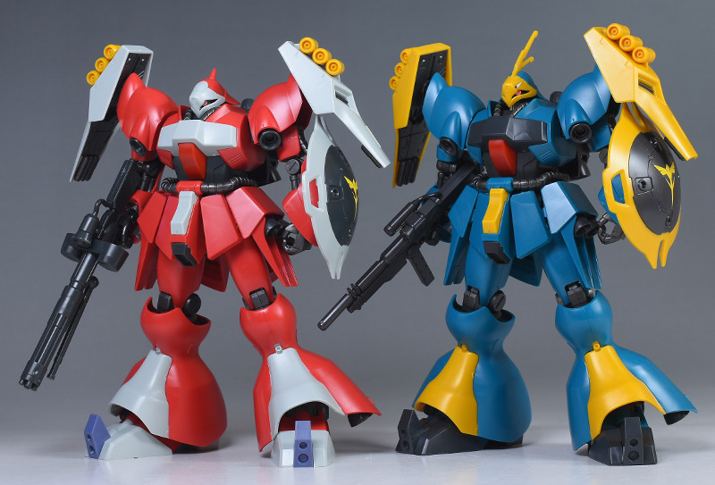 HGUC ヤクト・ドーガ(ギュネイ・ガス専用機) と並べて比較。頭部形状以外は全く同じ。ただしカラーリングが違っているのでだいぶ印象が違って見えます。ギュネイのほうがアンテナがあるのでヒロイック。劇中ではクェス機をサポートしていたので、ぜひ組み合わせてディスプレイさせたいところです。