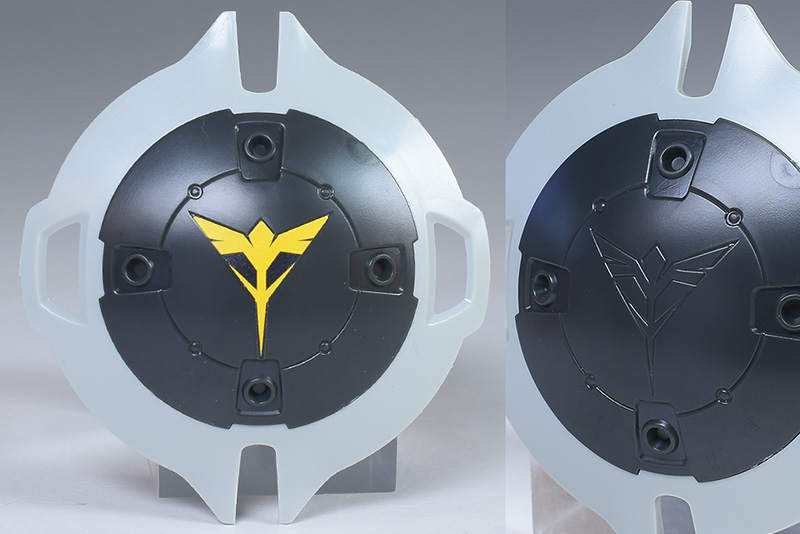 メガ粒子砲内蔵シールド。4門のメガ粒子砲を内蔵するシールドです。ハンマ・ハンマのものを原型にしたとのことで、形状も正円状のものになっています。表面のメガ粒子砲口は赤く塗り分けが必要。中央ネオ・ジオンマークはモールドの上からシールを貼っての色分け。難易度が高いですが塗装での塗り分けも可能です。