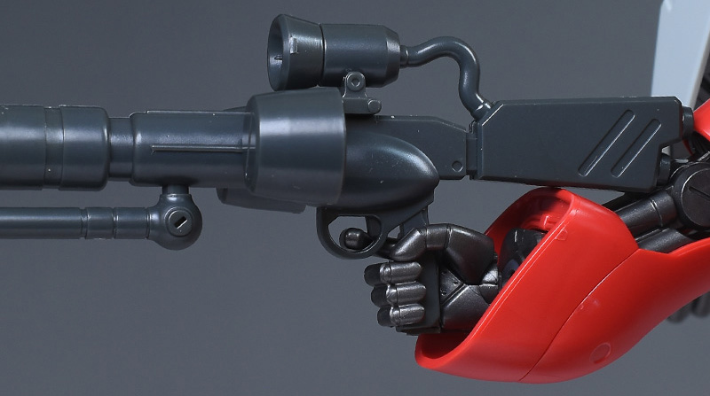 フォアグリップが前後に可動(ロール)し、腕可動の自由度も高いので、両手持ちはラクな姿勢で再現可能。フォアグリップが長いので左手が抜ける心配がなく、ポーズを常に維持することができます。シールドは干渉すると外れやすいので少し注意が必要。