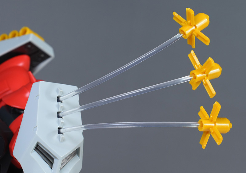 付属の軟質クリア棒を使うことで、ファンネルの射出シーンを再現することができます。軟質クリア棒は2本付属し、3等分して肩部バインダーに組付けます。