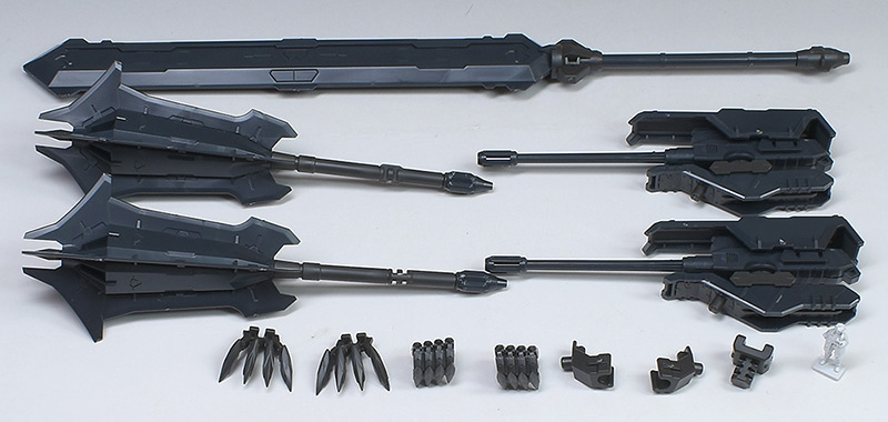 ソードメイス、ツインメイス✕2、腕部200mm砲✕2、武器用ジョイントパーツ✕2、指パーツ(平手用:左右、握り手用:左右)、ディスプレイ用ジョイントパーツ、三日月・オーガスフィギュアが付属。