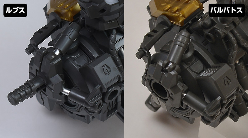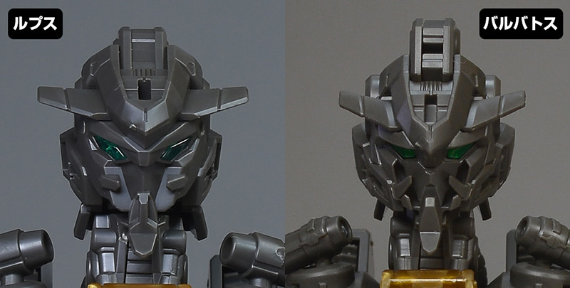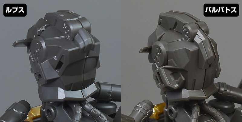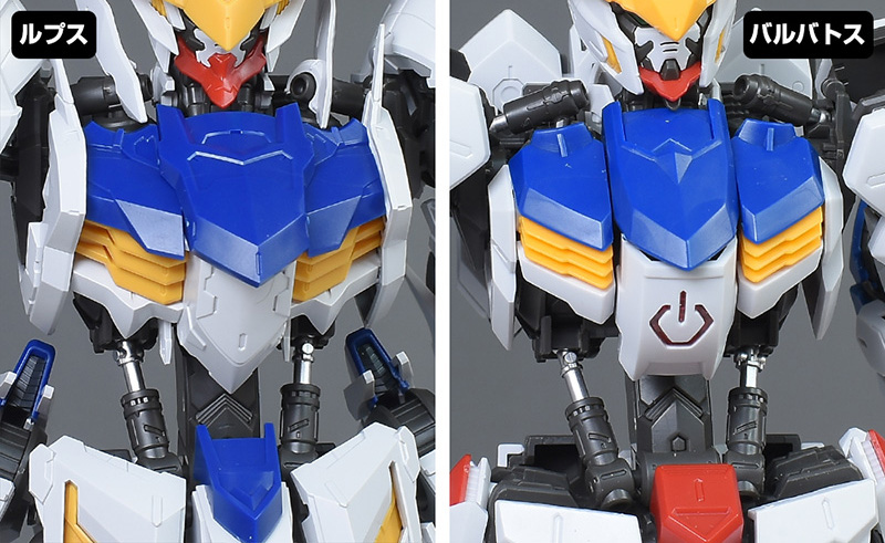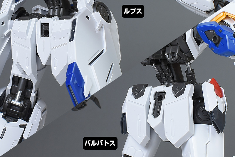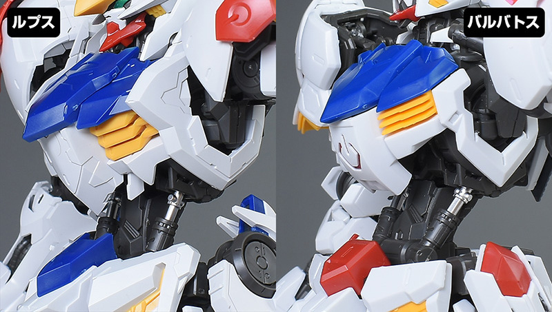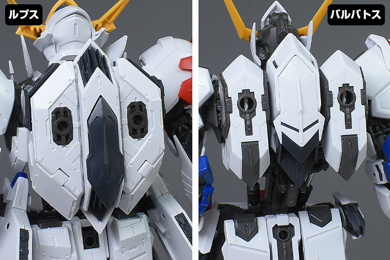 胸部・腹部をバルバトスと並べて比較。バルバトスはモールドがそれなりといった感じですが、ルプスは各部装甲(特に白い装甲)に細かなモールドが造形。荒々しくメカニカルなデザインになっています。